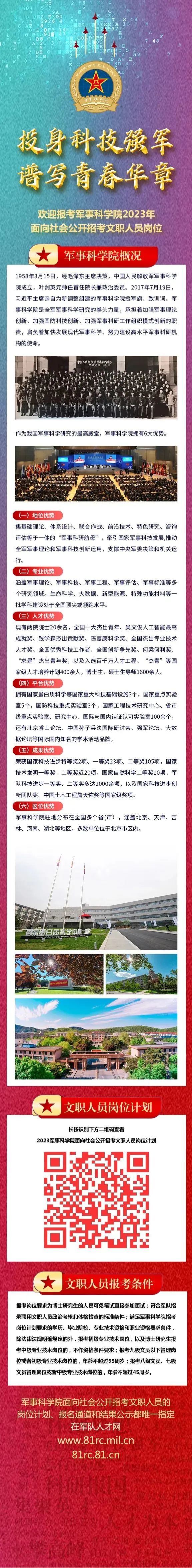 考生可于2023年1月13日8:00至17日18:00期间,登录军队人才网进行网上报名。全军组织统一笔试将于2023年2月19日在全国各直辖市、省会城市、自治区首府和部分较大的城市同时举行。根据计划安排,6月底前完成面试体检、政治考核、公示审批等工作。