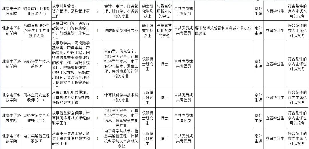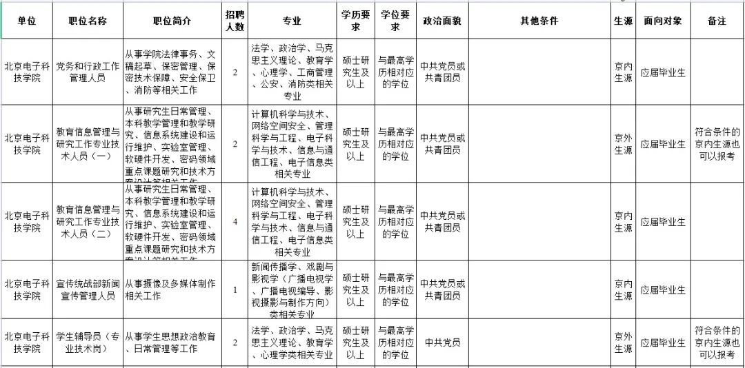 根据工作需要,按照《事业单位人事管理条例》和事业单位公开招聘有关政策规定,北京电子科技学院2023年度面向应届高校毕业生公开招聘工作人员26名。现将有关事项公告如下。