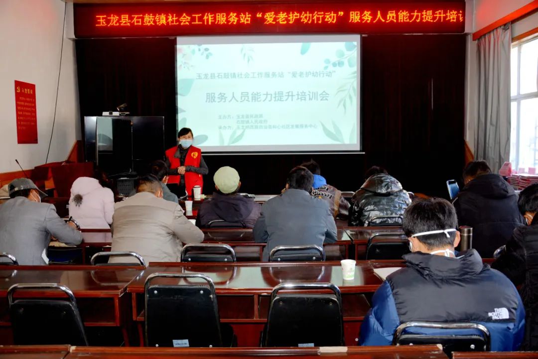 1月12日,石鼓镇社会工作服务站组织全镇11个村委会内的民政工作人员、儿童主任、老体协负责人员开展“爱老护幼行动”服务人员能力提升第一期培训。