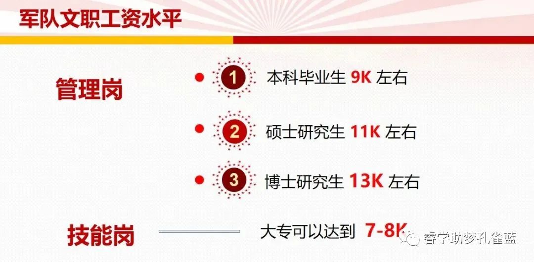 2、工资:以现役军官为参照系,军队建立统一的文职人员工资制度。高于当地事业单位和公务员,人均薪资10000+。