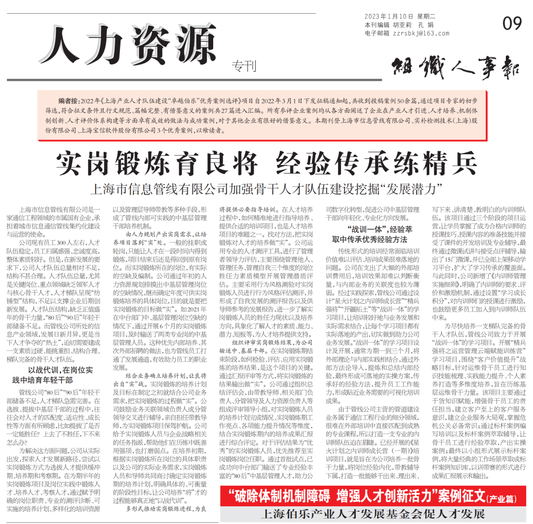 由中共上海市委组织部主办主管的《组织人事报》,刊发于2023年1月10日第9版人力资源专刊,向广大读者、人力资源从业人员分享管线经验。