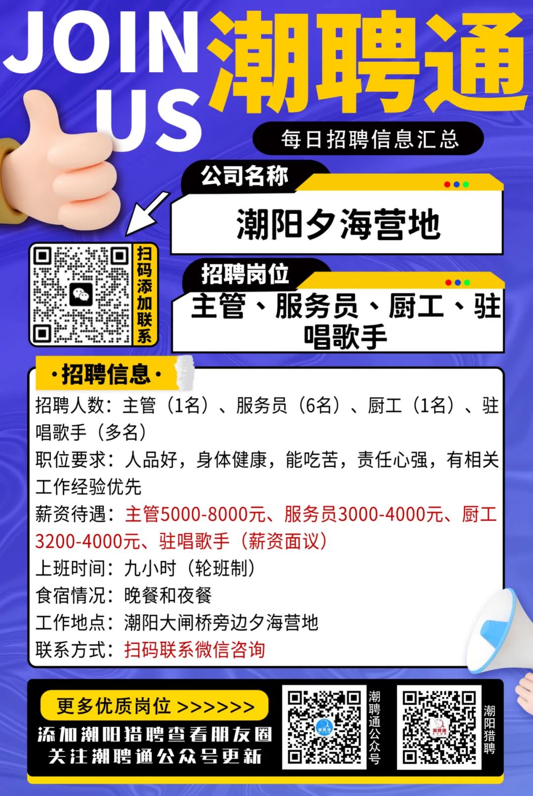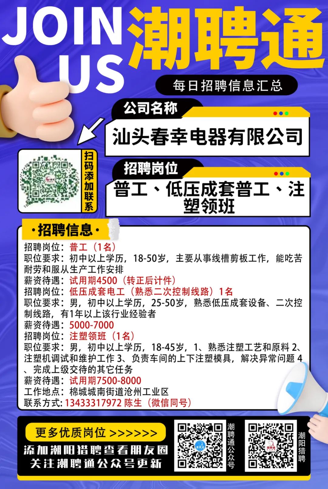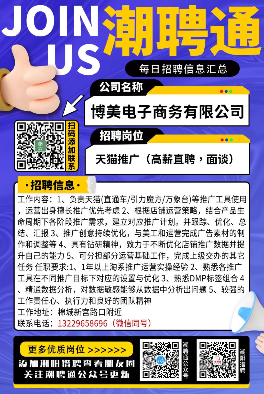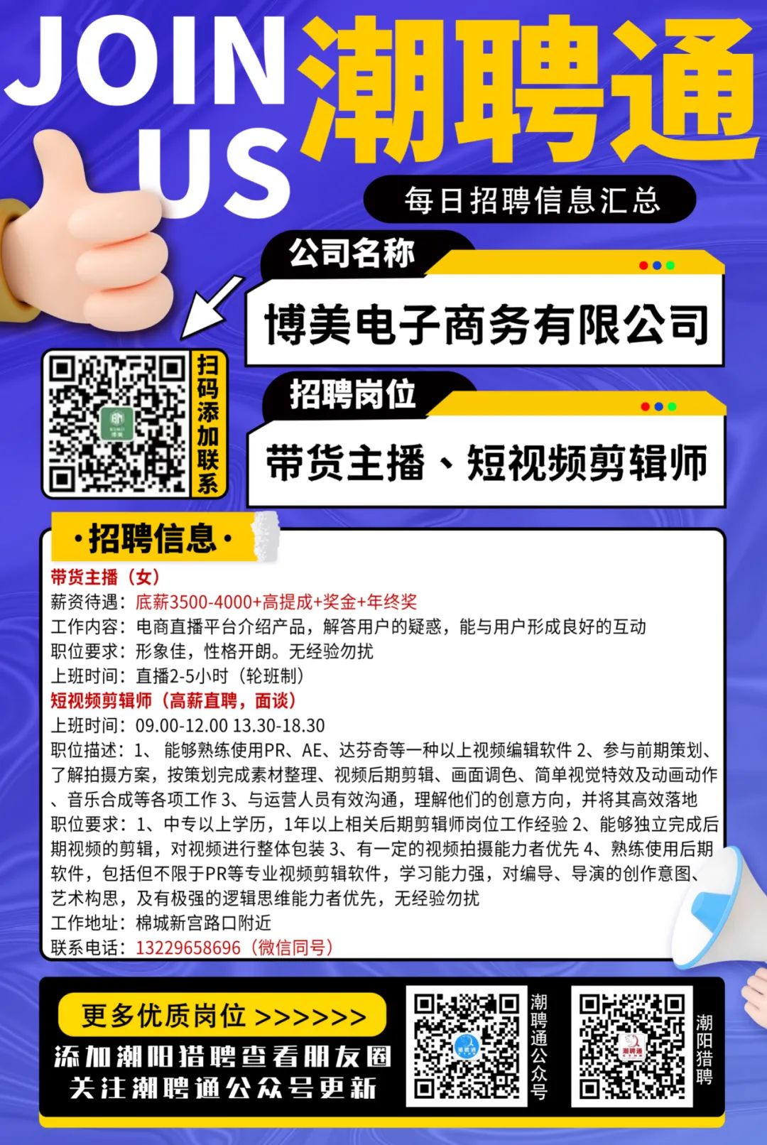 潮阳招聘专栏,需要人才招聘、猎聘的商户/企业,可联系潮阳生活通微信 cyhr002 或扫码添加潮聘通客服咨询投放。如已招到人请及时通知我们修改或删除。