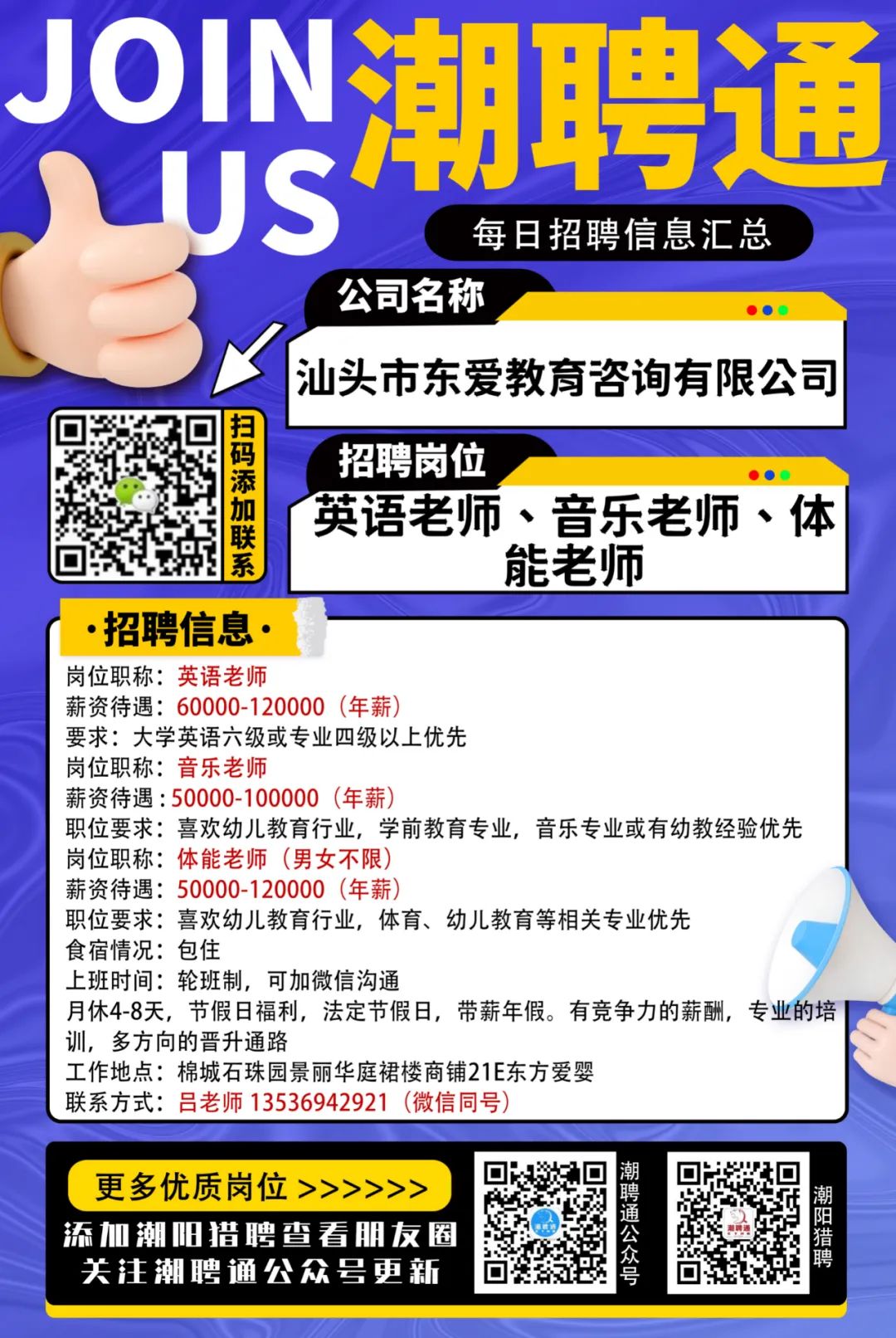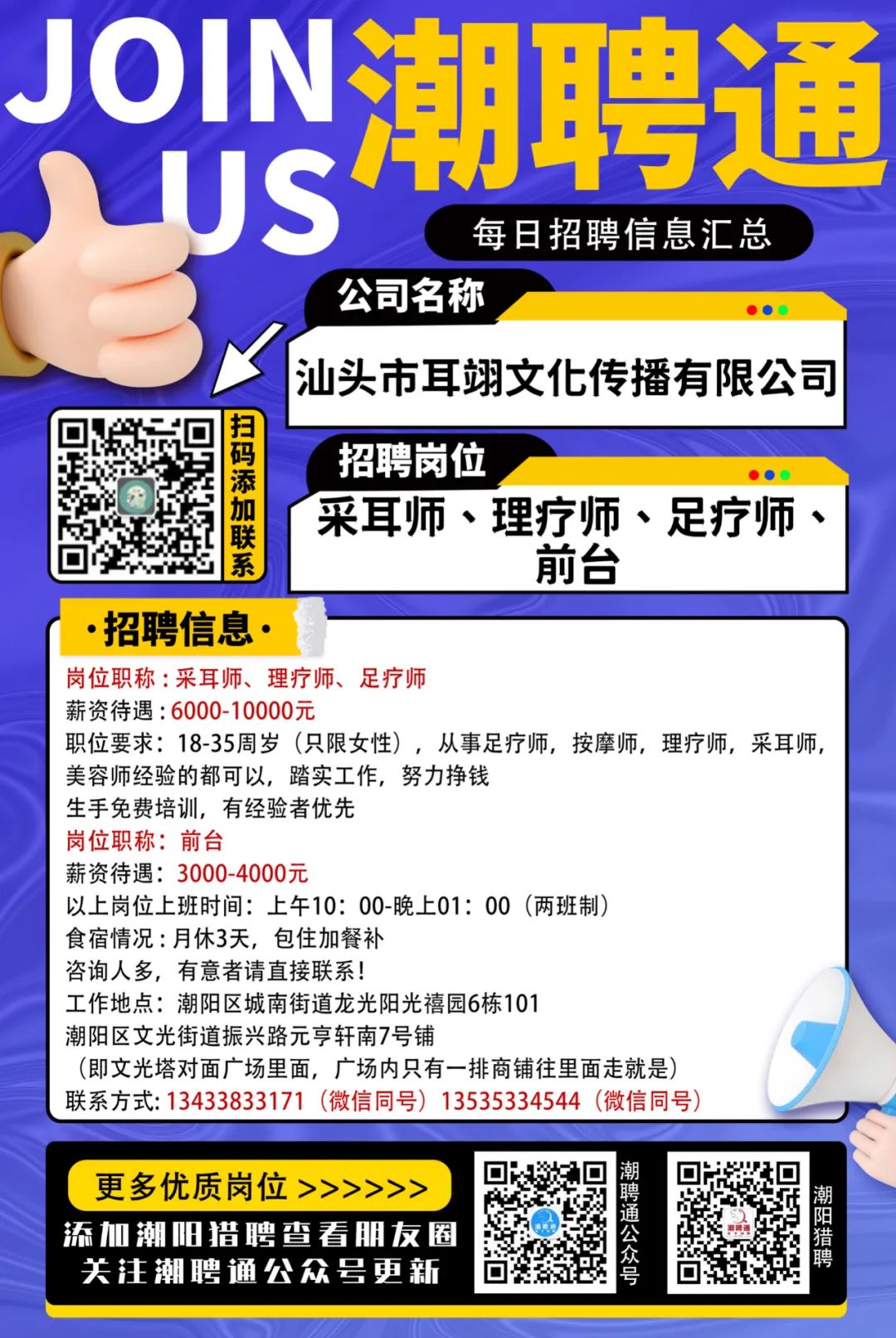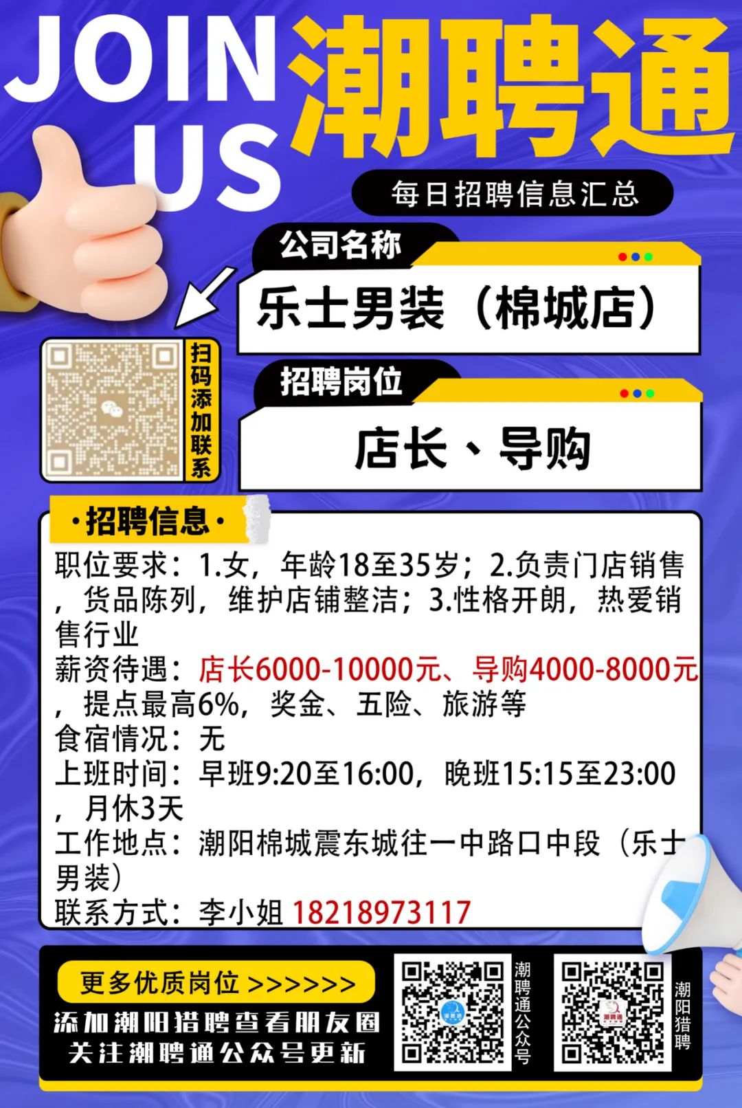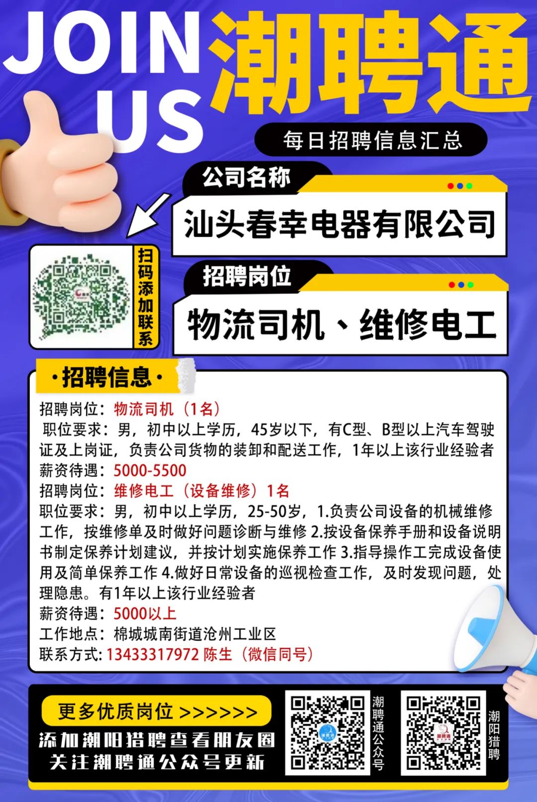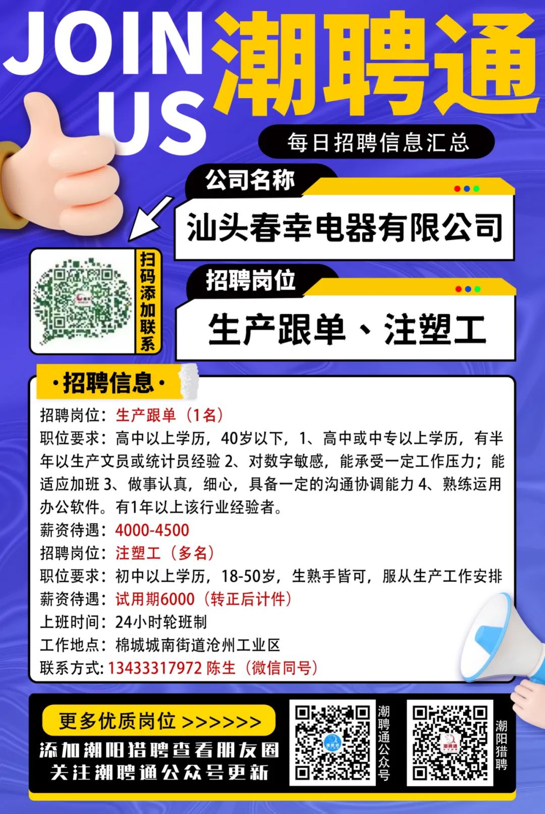 潮阳招聘专栏,需要人才招聘、猎聘的商户/企业,可联系潮阳生活通微信 cyhr002 或扫码添加潮聘通客服咨询投放。如已招到人请及时通知我们修改或删除。