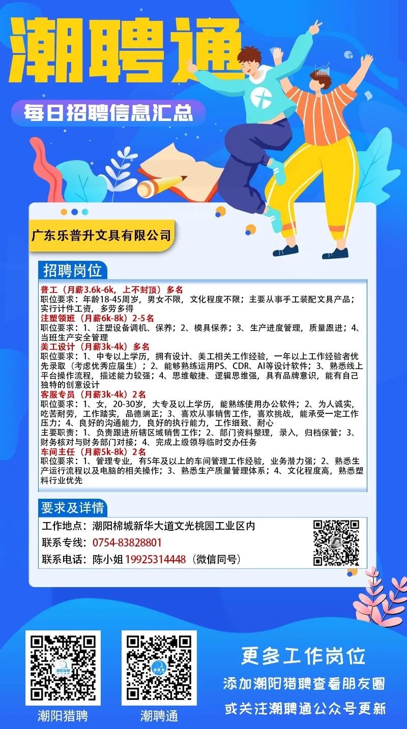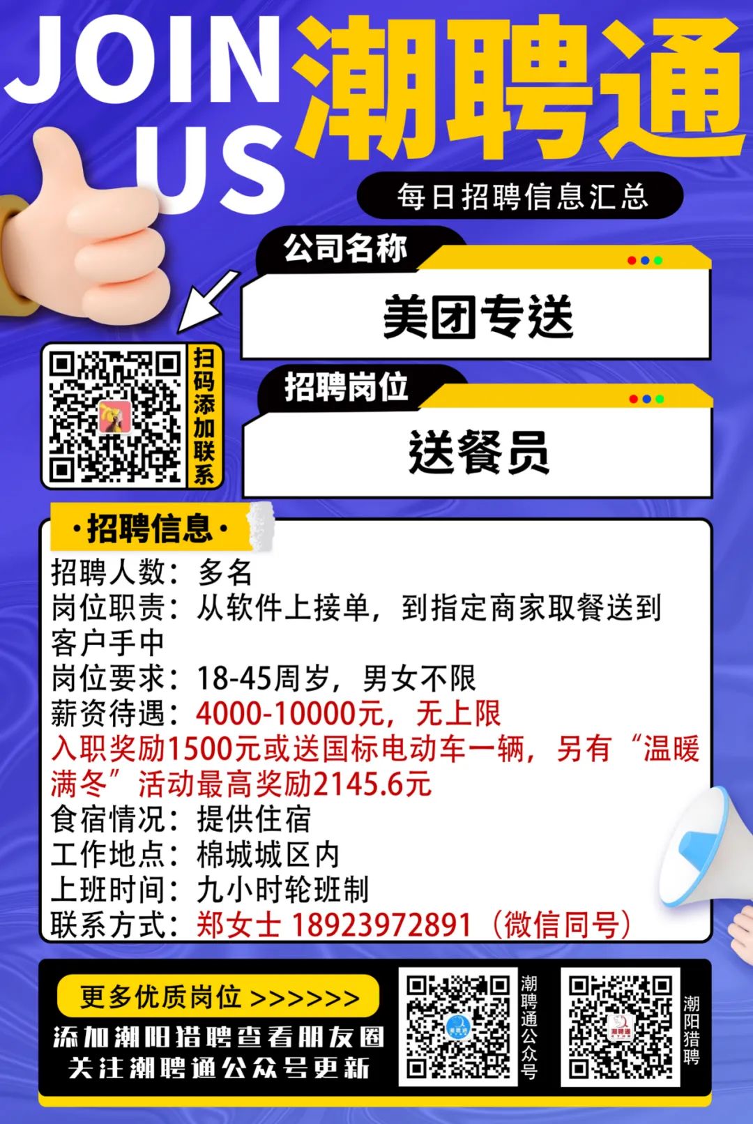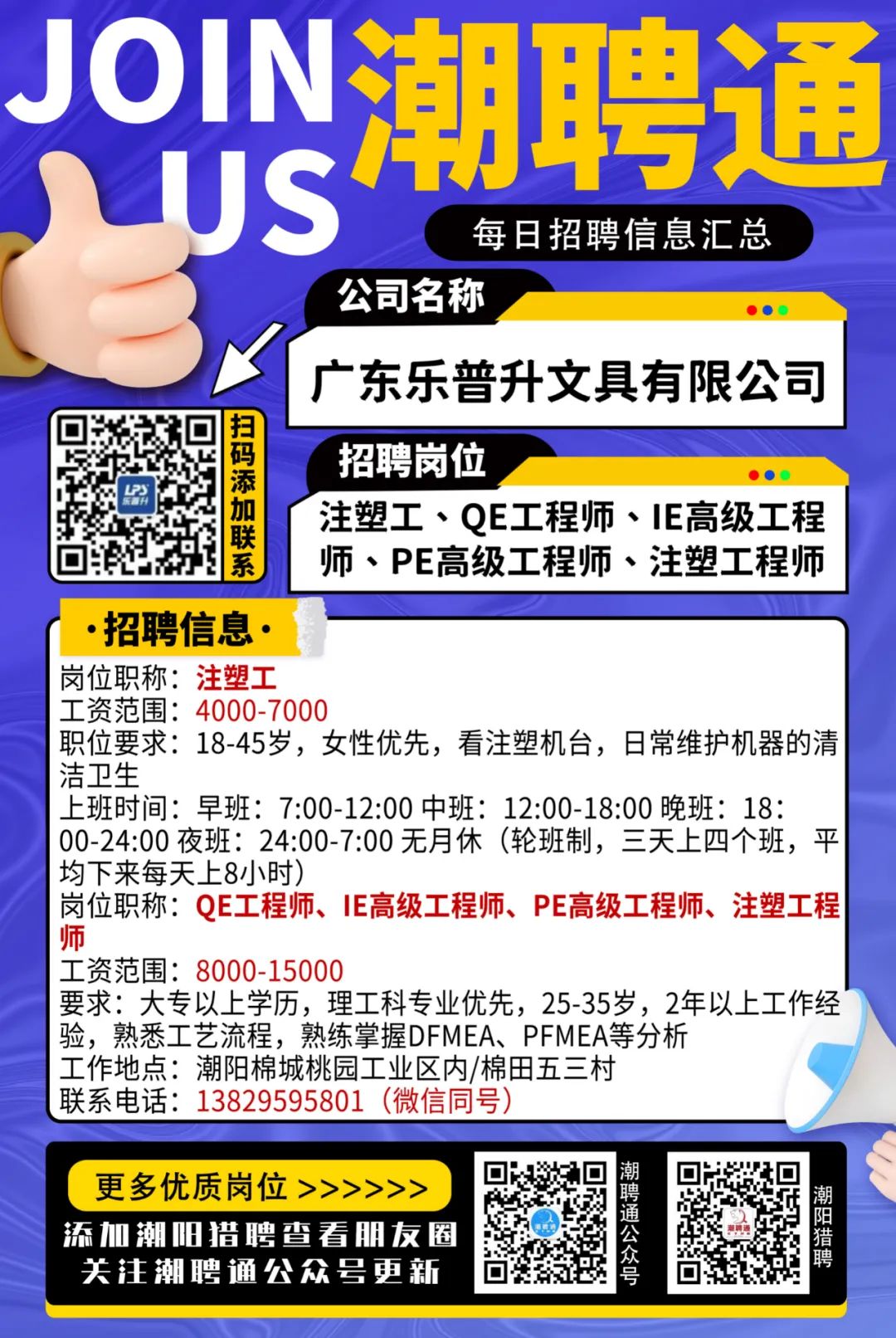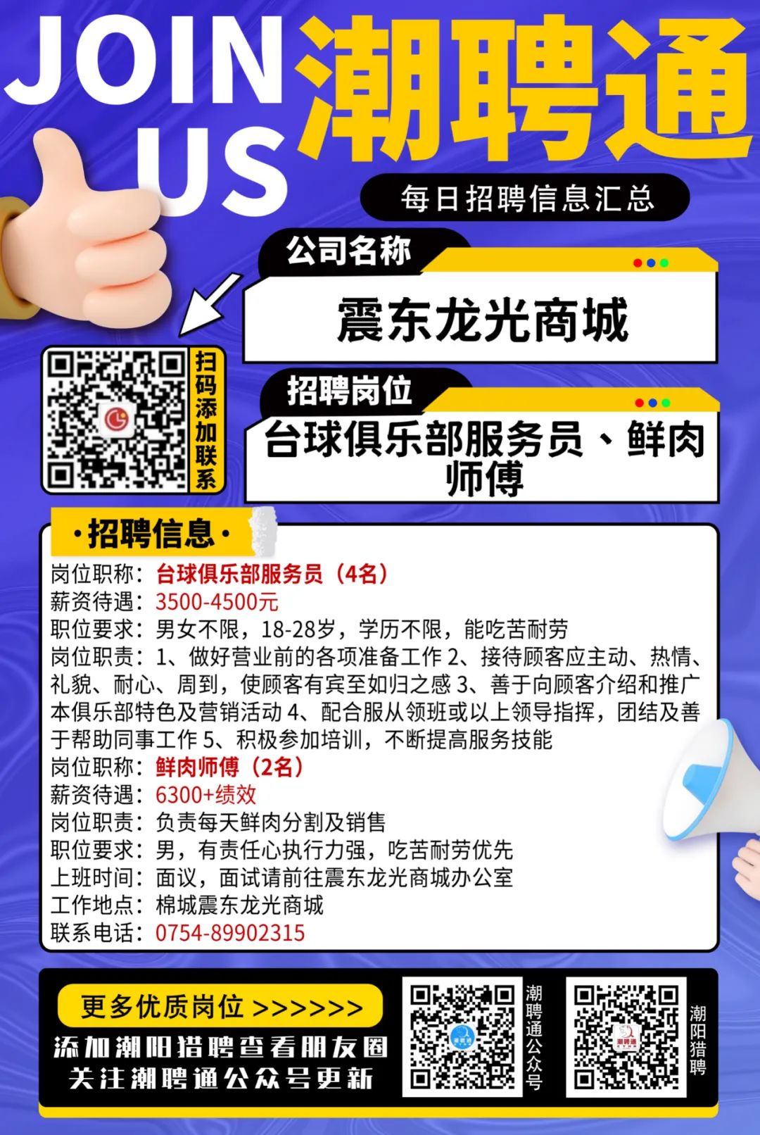 潮阳招聘专栏,需要人才招聘、猎聘的商户/企业,可联系潮阳生活通微信 cyhr002 或扫码添加潮聘通客服咨询投放。如已招到人请及时通知我们修改或删除。