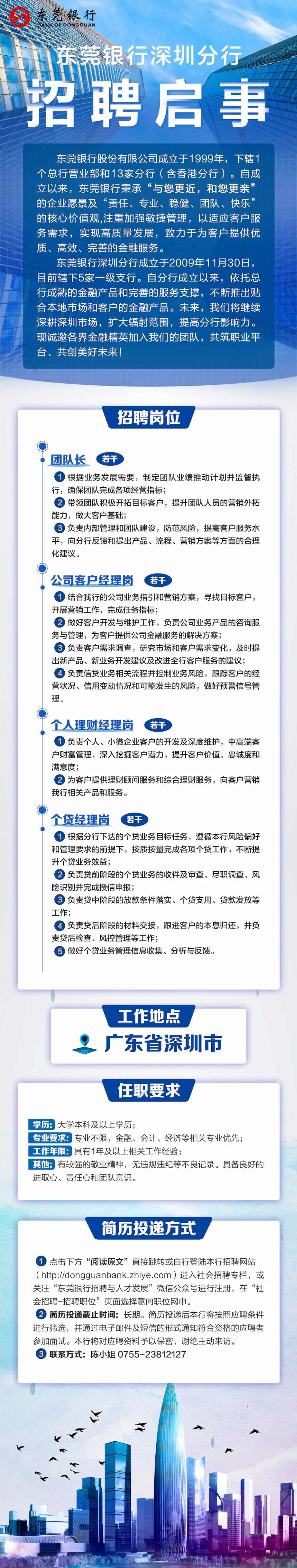 >【盐田招聘】银行相关工作!共4岗位,专业不限,东莞银行深圳分行招聘启事