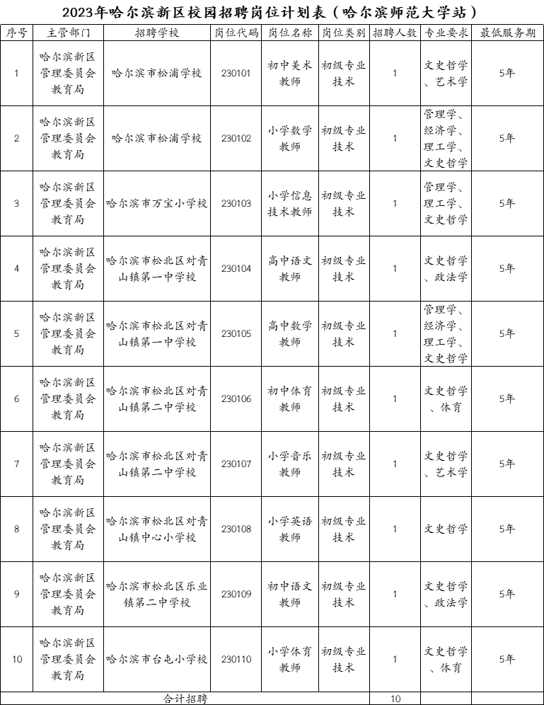 本次(哈尔滨师范大学站)计划招聘中小学事业编制教师10人,有关岗位要求详见《2023年哈尔滨新区教育系统所属中小学校校园招聘教师岗位计划表(哈尔滨师范大学站)》(以下简称《岗位计划表》)(附件1)。