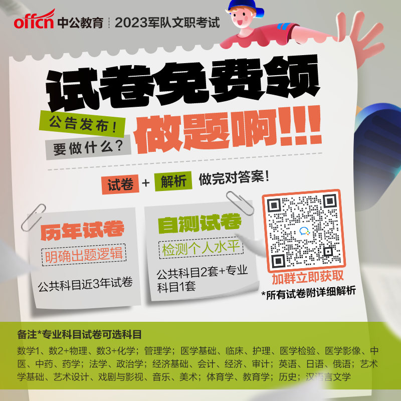 ☑报名时间: 报名时间:2023年1月13日8:00至17日18:00 报名资格条件初审截止时间:1月18日18:00 缴费截止时间:1月19日18:00 ☑准考证打印: 2023年2月14日9:00至19日14:00 ☑笔试时间: 全军统一考试于2023年2月19日进行  2023年全军面向社会公开招考文职人员公告军队文职人员的招考对象为普通高等学校毕业生或者社会人才。其中:普通高等学校毕业生包括应届毕业生和非应届毕业生,应届毕业生是指2023年毕业且在当年取得相应毕业证和学位证的毕业生;非应届毕业生是指在两年择业期内未落实工作单位,其户口、档案、组织关系仍保留在原毕业学校,或者保留在各级毕业生就业主管部门(毕业生就业指导服务中心)、各级人才交流服务机构和各级公共就业服务机构的2021年、2022年未就业普通高校毕业生。 定向招考对象为军队烈士、因公牺牲军队人员的配偶子女、未婚军队烈士的兄弟姐妹,以及现役军人配偶。 2023年主要面向社会公开招考七级文员以下岗位的管理类文职人员和中级以下岗位的专业技术类文职人员。报考人员应当符合《中国人民解放军文职人员条例》规定的基本条件,同时具备下列资格条件: (一)政治条件。报考人员应当符合军队招录聘用文职人员政治考核的标准条件。 (二)学历条件。一般应当具有普通高等学校全日制本科以上学历。报考在艰苦边远地区、岛屿的岗位,以及特殊岗位可不作全日制要求。驻艰苦边远地区、岛屿的单位定向招考军队烈士、因公牺牲军队人员的配偶子女,未婚军队烈士的兄弟姐妹,以及现役军人配偶,除教学、科研、工程、医疗专业技术岗位外,报考学历要求可以放宽至大学专科。报考护理、艺术、体育专业岗位的,可为大学专科以上学历。 (三)资格条件。应当具有招考岗位要求的职称和职业资格。除法律法规明确规定的外,报考初级专业技术岗位,以及博士研究生报考中级专业技术岗位的,不作资格条件要求。 (四)身体条件。应当符合军队招录聘用文职人员体格检查的标准条件。 (五)年龄条件。报考九级文员以下管理岗位或者初级专业技术岗位的,年龄不超过35周岁;报考八级文员、七级文员管理岗位或者中级专业技术岗位的,年龄不超过45周岁。 (六)其他条件。在符合以上条件的前提下,具体报考条件由用人单位根据招考岗位需要确定。报考人员取得学历学位和职称、职业资格的截止时间为2023年7月31日,其中免笔试直接面试岗位截止时间可以为录用时间,但不得超过2023年12月31日。