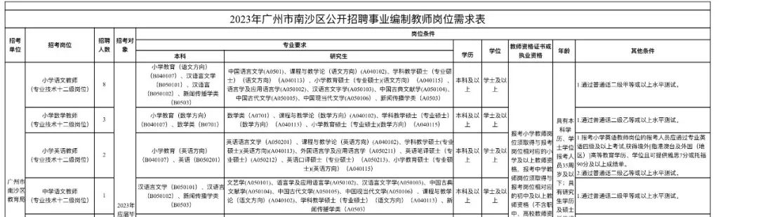 扫码添加助手微信 加入南沙职聘HR群  根据《广东省事业单位公开招聘人员办法》(粤府令第139号)等文件精神,按照“公开、平等、竞争、择优”的原则,为满足我区师资配备需求,决定公开招聘事业编制教师134名,其中南沙区教育局统一招聘20名,联合7所合作办学学校共招聘114名(包括联合广州外国语学校教育集团公开招聘事业编制教师27名、联合华南师范大学公开招聘事业编制教师29名、联合广州二中教育集团公开招聘事业编制教师13名、联合广州大学附属中学公开招聘事业编制教师13名、联合广州市教育研究院公开招聘事业单位编制教师8名、联合广州执信教育集团公开招聘事业单位编制教师6名、联合广铁一中教育集团公开招聘事业单位编制教师18名)。为了考生和学校间可以更好的进行双向选择,本次招聘报考人员只能选报一个招聘岗位,具体岗位和人数详见全国事业单位招聘网相关公告。现将南沙区教育局统一招聘20名事业编制教师有关事项公告如下:(一)2023年毕业生,即于2023年1月1日至2023年8月31日之间取得普通高等院校本科及以上学历并获得学士及以上学位的毕业生(含持境外学历学位证书人员)。(二)符合《广东省人力资源和社会保障厅粤港澳大湾区(内地)事业单位公开招聘港澳居民管理办法》第五条所列条件的香港特别行政区、澳门特别行政区永久性居民中无外国居留权的港澳2023年毕业生。报考人员须具备《广东省事业单位公开招聘人员办法》(广东省人民政府令139号)要求的基本条件及以下条件:1.具有中华人民共和国国籍,遵守中华人民共和国宪法和法律法规;2.符合新时代中小学、幼儿园教师职业行为十项准则要求;4.具备招聘岗位所需的任职资格和职业(执业)资格;8.非广州市常住户籍人员应符合广州市人民政府办公厅《关于印发广州市引进人才入户管理办法的通知》(穗府办规〔2020〕10号)规定的广州市户口迁入条件;具有本科学历、学士学位报考人员35周岁及以下;具有研究生学历及硕士学位报考人员可放宽至40周岁;具有博士学位的报考人员可放宽至45周岁。1.报考人员须具备需求表所列出的其报考岗位相对应的具体资格条件。2.报考人员所修学的专业必须与报考的岗位相对应,专业以所获毕业证书上的专业为准;学位种类不等同于报考专业。普通高等院校研究生可以本科专业报名,但用于报考的学历层次和学位层次应同时符合岗位要求。3.如报考人员所学专业未列入《广东省2023年考试录用公务员专业参考目录》(见附件3)(或没有专业代码),可选择专业目录中的相近专业报考,所学专业必修课程须与报考岗位要求专业的主要课程基本一致,并在资格审查时提供就业协议书或就业推荐表、所学专业课程成绩单(须有毕业院校教务处盖章)、毕业院校出具的课程对比情况说明等材料,供审查是否符合要求,以审查结果为准。4.报考岗位有专业方向要求的,若报考人员的课程成绩单无法明确显示专业方向,还须在现场报名和资格审查时提供报考人员毕业院校出具的专业方向证明原件及证明专业方向的相关材料等,供审查是否符合要求,以审查结果为准。5.报考人员须具备与报考岗位要求相对应的资格证书(应聘小学教师的必须具备小学及以上教师资格,应聘中学教师的必须具备中学及以上教师资格),承诺在聘用前取得,否则取消聘用资格。对在2021年及2022年中小学(含幼儿园、中等职业学校)教师资格考试中受疫情影响考生(2021年及2022年中小学教师资格证NTCE笔试成绩单或面试成绩单“受到疫情影响”栏标注为“是”)的报考人员如获聘用,须在1年内取得相应的教师资格证书且试用期内先上岗从事辅助性教育教学工作,试用期内未取得相应教师资格证的,依法解除聘用合同。6.报考语文教师岗位的人员应通过二级甲等及以上普通话测试,其他岗位报考人员应通过二级乙等及以上普通话测试。7.报考小学英语教师岗位的报考人员须在聘用前取得全国高校英语专业四级及以上合格证书,报考中学英语教师岗位的报考人员须在聘用前取得全国高校英语专业八级合格证书(获得境外[指港澳台及外国(地区)]高等教育学历、学位且可提供雅思7分或托福90分及以上成绩单的考生除外)。获得境外[指港澳台及外国(地区)]高等教育学历、学位的报考人员如无法提供通过专业英语四级及以上考试的证明材料,应提供雅思7分或托福90分及以上成绩单。1.曾受行政开除处分未满五年、尚未解除纪律处分或者正在接受纪律审查的人员;2.因涉嫌违法违纪正在接受审计、纪律审查,行政调查的人员;3.涉嫌犯罪,司法程序尚未终结,刑事处罚期限未满的人员;5.近五年内,在机关、事业单位招录(聘)考试、体检或考察中曾有违纪、造假等行为的人员;6.报考人员不得报考聘用后即构成回避关系的岗位的人员;7.按照国家有关规定,需到定向单位工作满服务年限或对转任有其他限制性规定的人员;8.法律、法规和规章规定不宜聘用或不允许从事教师职业的其它情形的人员;本条所规定的处分期限的计算截止日期为本次公开招聘报名首日。本次公开招聘依次按照网上报名、考试确认、笔试与心理品质测评、资格审查、面试、体检、组织考察、公示、聘用等程序进行。报考人员须严格按照考试要求携带身份证(含临时身份证或公安部门开具的带有相片的有效身份证明)、准考证、符合