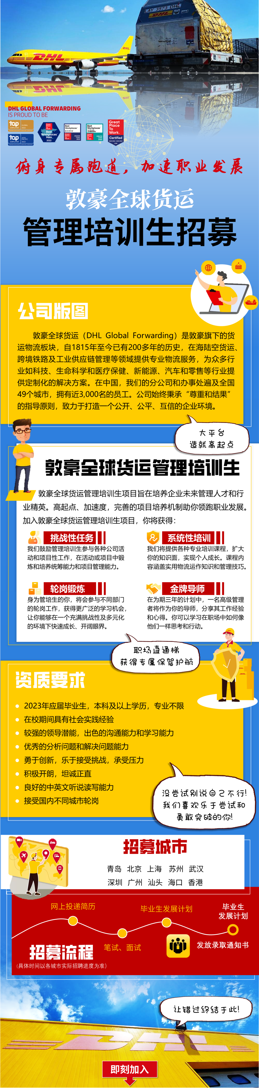 ![]() ???长按上图识别二维码 可获取【简历评估】机会 扫码回复“23春招” 领取更多名企校招网申表格? ![]() DHL全球货运管理培训生启动! ![]() 重点摘要 ![]() 2023年应届毕业生,本科及以上学历 ![]() 全球货运管理培训生 ![]() 扫描下方二维码投递简历 ![]() 招聘详细如下: ![]() 扫码回复“23春招” 领取更多名企校招网申表格? ![]() ------------ 如何快速进入500强名企 懂职帝提供: 名企实习/项目、1对1辅导、内推资源等 帮你快速进入: 摩根大通、中信证券、麦肯锡、德勤、腾讯、中国烟草等名企 真实学员案例如下: ?? ![]() 扫描下方二维码 咨询&报名懂职帝【求职无忧计划】 帮你拿到名企offer ?? ![]() ![]() 点击“阅读原文”,免费听取求职课程 |