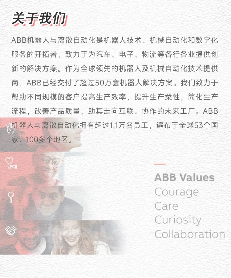 毕业在即, 还没有收到心动的offer? 梦想无限, 立志于智能制造数字化行业? 满载热爱, 一身才华无处施展? 那这个机会,你可千万别错过! ![]() ![]() ![]() 在ABB机器人全球培训生项目中 你可以大胆尝试,挖掘自身潜力 你可以绽放自我,探索职业方向 你将遇见新机遇,成长超乎想象 现在,请跟上阿伯伯的脚步 一起走进机器人全球培训生项目 1 机器人全球培训生项目大揭秘 ![]() 作为一家全球技术领导企业,ABB致力于建立引领全球的专业技术团队。我们正在寻找具有上进心、渴望与公司一起学习和成长、愿意保持开放和灵活的态度,从初学者的角色开始学习,未来能成为有技能才能的领导者。因此,ABB机器人全球培训生项目应运而生,旨在为未来的业务培养年轻和积极进取的人才。 2 快速成长,收获满满 ![]() 国际化平台 两年轮岗,开拓专业视角,领略多元文化魅力。 ![]() 业界大咖指引 高阶经理1对1指导,深度启迪无限潜能,加速你的职业发展。 ![]() 多元培养体系 有趣又实用的培训课程,全面系统的实践,多维能力的发展与锻炼,领导技能UPUP! 3 热招职位 职位方向 ★ 供应链质量/市场与销售/项目管理/控制与软件工程 教育背景 ★ 2021-2023届全日制硕士及以上学历毕业生,包括但不限于机械、电气、自动化、机器人等工程类、计算机科学类、管理类专业 语言技能 ★ 英语可作为工作语言 个人能力 ★ 具备数字化和以客户为中心的思维模式 ★ 高度自信及自我驱动能力 ★ 乐于接受挑战 ★ 团队精神,协作能力 ★ 具备创新能力和改善事物的渴望 4 招聘流程划重点 ![]() 心动不如行动 机器人全球培训生之旅等你开启! 登录招聘网站或扫描二维码 获取更多职位信息 还有校招补录职位等你哦! 1、PC端网申平台 http://campus.51job.com/ABB2023 2、手机扫码投递 ![]() ![]() ![]() 点击“阅读原文”,加入ABB 喜欢请分享并点赞、“在看” ![]() |
