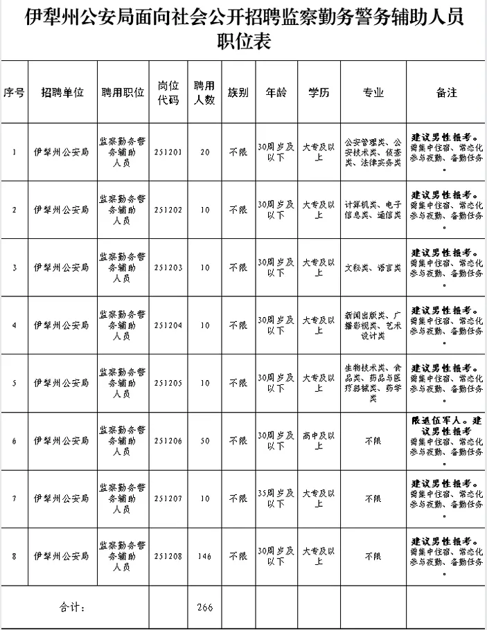 全国招聘信息大全汇总根据《中华人民共和国监察法》《新疆维吾尔自治区公安机关警务辅助人员招聘办法》等相关规定,新疆伊犁州公安局现面向社会公开招聘266名警务辅助人员,主要负责监察勤务工作。现就有关事项公告如下: