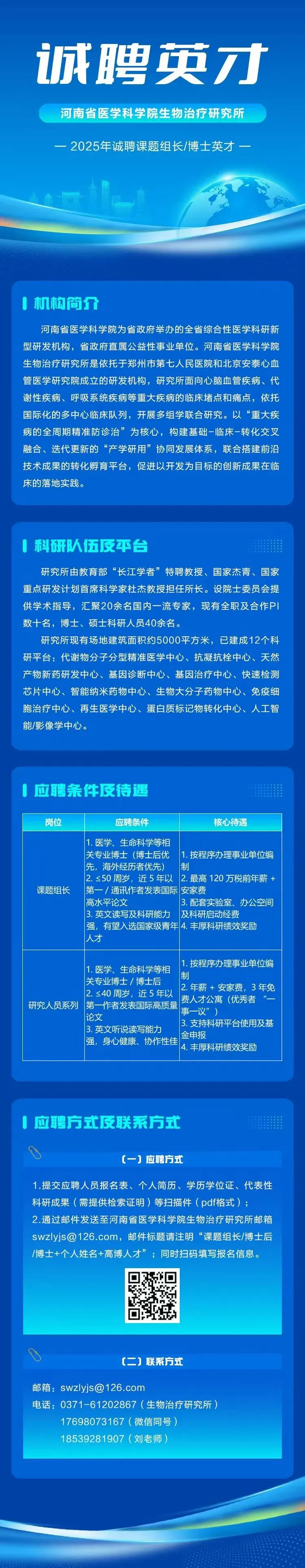 >招聘 | 河南省医学科学院生物治疗研究所2025年诚聘课题组长/博士英才