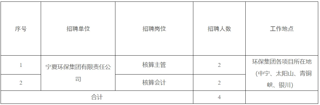 宁夏环保集团有限责任公司属宁夏国有资本运营集团有限责任公司二级子公司,由宁夏国有资本运营集团有限责任公司与宁夏水务集团有限公司共同出资组建,公司成立于2017年8月,主要承担自治区公益性、准公益性、经营性环保产业项目的规划、投资、建设、运营管理。宁夏环保集团有限责任公司及各权属公司,计划面向社会公开招聘财务人员4名: