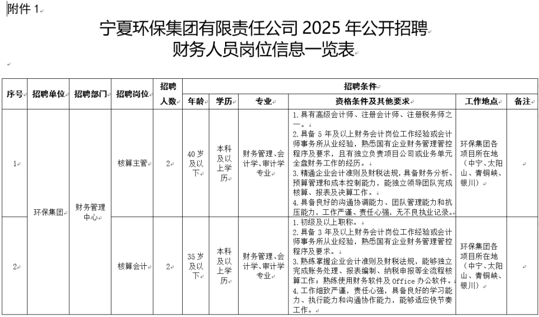 坚持党管人才,坚持德才兼备、以德为先、任人唯贤,坚持“公开、平等、竞争、择优”的原则,严格执行组织人事工作纪律,面向社会公开择优招聘工作人员。3.具有良好的政治素质和道德品行,廉洁自律,诚实守信;4.具有与招聘岗位要求相适应的学历、学位、专业、技能、工作经历等条件;5.具有良好心理素质和能够正常履行职责的身体素质;6.熟悉岗位专业知识,掌握工作范围内的政策法规,善于团结协作,具备较强的组织协调和沟通能力;8.各岗位要求的具体年龄以应聘人员有效身份证日期为准,自报名结束之日起算;岗位要求的专业条件均为报名应聘人员获得的最高学历所对应专业;岗位要求的工作经验条件,工作经验截止时间自报名结束之日起算,其中因工作单位变化而中断时间的,其在不同单位工作的时间可以累计计算。2.受过司法机关刑事处罚的;受到组织处理或者党纪、政纪处分,在影响期内的;涉嫌违纪违法正在接受审查调查尚未作出结论的;国家法律法规、党纪政纪和有关政策规定不能担任企业领导人员职务的;被依法列为失信联合惩戒对象仍在惩戒期的;在各级各类公务员、事业单位招考(聘)中被认定有违纪违规行为且被记入诚信档案库仍在记录期的;3.由于个人原因,导致企业出现严重亏损,或造成企业资产严重流失和重大经济损失的; 5.按照国有企业选人用人回避制度有关规定实行回避制,与应聘企业管理人员有亲属关系(直系血亲和三代以内旁系亲属)的;1.发布公告:通过宁夏回族自治区人民政府国有资产监督管理委员会(以下简称“自治区国资委”)、宁夏国有资本运营集团有限责任公司(以下简称“宁国运集团”)网站、宁夏环保集团公众号等平台发布招聘公告,符合条件者均可报名,每人限报1个岗位,多报视为无效报名。2.报名时间:2025年12月20日9:00至12月29日18:00,逾期不予受理。3.报名方式:报名采取线上报名方式,应聘人员须在规定时间内登录宁国运集团招聘报名系统上传报名材料,每人限报一个岗位,多报无效。(1)网上报名。应聘人员在规定时间内登录招聘报名链接https://rz.nxgyzb.com:2443/zp.html#/进行报名。不接受其他形式报名。(2)用户注册。注册时,须准确填写本人姓名、身份证号、联系电话和电子邮箱,并妥善保管电子邮箱、手机号码和密码。(3)报名上传资料:提供《宁夏环保集团有限责任公司应聘报名表》(见附件,需手写签名上传)、身份证、学历证书、学位证书、专业技术职称证书、职(执)业资格证书、招聘岗位要求的工作经验材料(工作经验材料可提供劳动合同或单位证明或年度考核表)、相关业绩证明材料、近期1寸免冠蓝底证件照(电子版)、验证有效期在6个月以内的《教育部学历证书电子注册备案表》或《学籍在线验证报告》、无犯罪记录证明(证明时间段自满18岁之日起至报名之日止)和银行出具的近半年个人征信报告等扫描件。(1)《宁夏环保集团有限责任公司应聘报名表》填写信息不全、标注不清、未手写签名的,或报名资料提交不完整的,均视为无效报名。(2)应聘人员应如实填报个人真实信息。如发现与事实、报考岗位招聘条件不符,取消应聘资格;已被录用并签订劳动合同的,解除劳动合同关系。1.对应聘人员提交的报名资料进行资格初审,不符合应聘条件的,取消应聘资格,资格初审通过的,通过短信或邮箱的方式通知进行现场资格审核。报名结束后5个工作日内,应聘人员未接到通知,视为资格审核未通过,不再另行通知应聘人员。2.现场资格审核需准备材料:《应聘报名表》(本人签字版)、身份证、学历证书、学位证书、专业技术职称证书、职(执)业资格证书、任职及相关经营业绩证明材料、验证有效期在6个月以内的《教育部学历证书电子注册备案表》或《学籍在线验证报告》、无犯罪记录证明、个人征信报告等与报名表填写情况有关的证明材料原件及复印件各1份,核验后原件退回。现场资格审核与资格初审结果不一致的,以现场资格审核结果为准。3.资格审查贯穿公开招聘全过程,凡弄虚作假者,一经查实,取消其应聘资格。4.岗位招聘人数与通过资格审核合格人数的比例原则上不得低于1:3。如果资格审核合格人数不足3人的,由公司公开招聘领导小组研究。1.考试形式。采用笔试+面试形式,笔试、面试具体时间和地点另行通知。2.笔试内容。笔试以闭卷方式进行,采用百分制计分,主要测试应聘人员胜任工作岗位应具备的基本理论素养和综合能力,以及分析解决工作中实际问题的能力。根据笔试成绩由高分到低分进行排序,按照岗位招聘人数与笔试人数1:3的比例确定面试人员,未达到面试开考比例的岗位,由公司公开招聘领导小组研究。若最后一名笔试成绩并列而超过1:3比例的,则一并进入面试。3.面试内容。面试以半结构化方式进行,采用百分制计分,主要测试应聘人员的基本素质、专业知识、岗位适应能力、语言表达能力、逻辑思维能力、综合分析能力、应变能力及心理素质等。计算方法:考试总成绩=笔试成绩×40%+面试成绩×60%,保留至小数点后两位数字。合格分数线:考试总成绩满分为100分,合格分数线为60分,低于合格分数线者不予录取。根据考试总成绩,按照岗位计划招聘人数1:1的比例,从考试总成绩达到合格分数线以上的应聘人员中,由高分到低分排序结果确定考察、体检对象。考试总成绩出现并列时,以面试