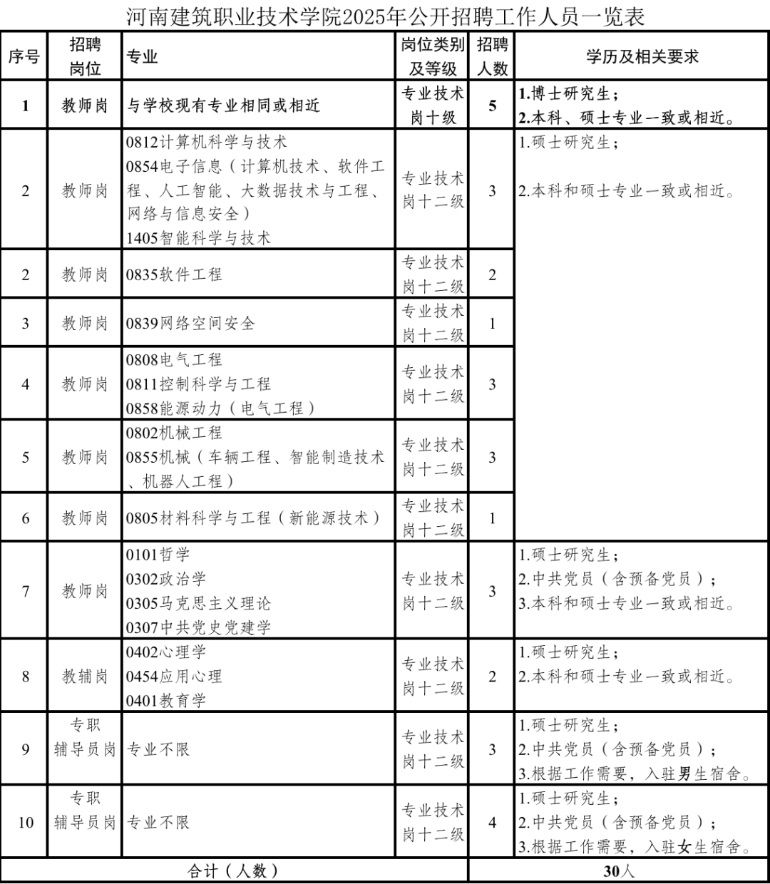 根据我校专业技术人员岗位空缺情况和学校发展需要,拟招聘博士研究生5名、硕士研究生25名。详见附件《河南建筑职业技术学院2025年公开招聘工作人员一览表》(招聘专业以国务院学位委员会、教育部印发的《研究生教育学科专业目录(2022)》为准)。