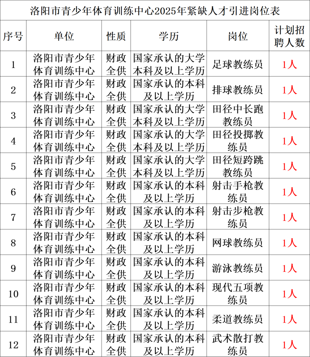 详见《洛阳市青少年体育训练中心2025年紧缺人才引进岗位表》(附件1)。