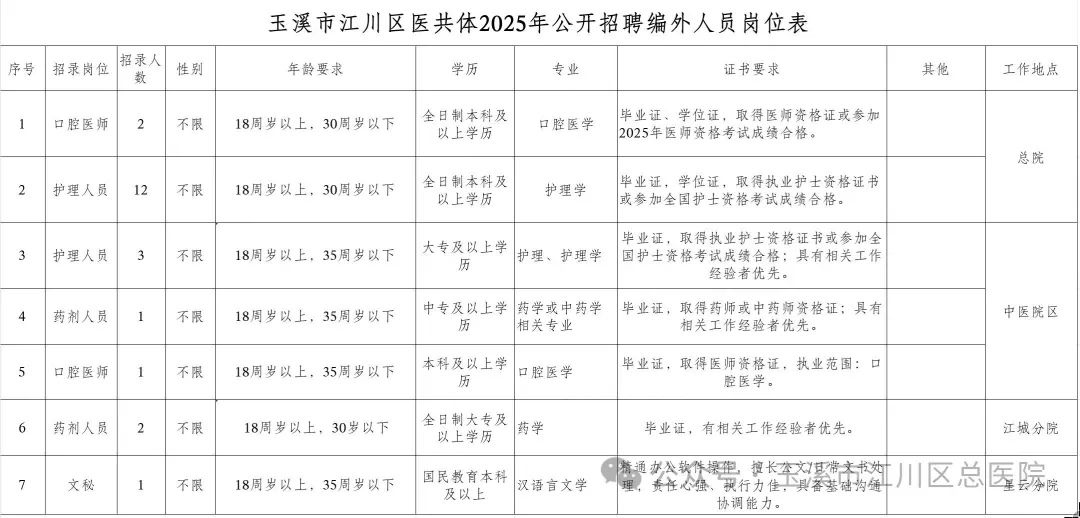 玉溪市江川区县域紧密型医共体总医院成立于2022年11月,下设一总院二院区一中心六分院。现因医疗业务发展需要,决定面向社会公开招聘编外人员22名,现将有关事项公示如下: