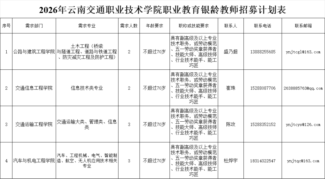 按照省教育厅关于招募职业教育银龄教师的有关要求,学校拟开展新聘银龄教师工作,具体招募学院、专业、人数及联系方式详见《2026年云南交通职业技术学院职业教育银龄教师招募计划表》(附件1)。