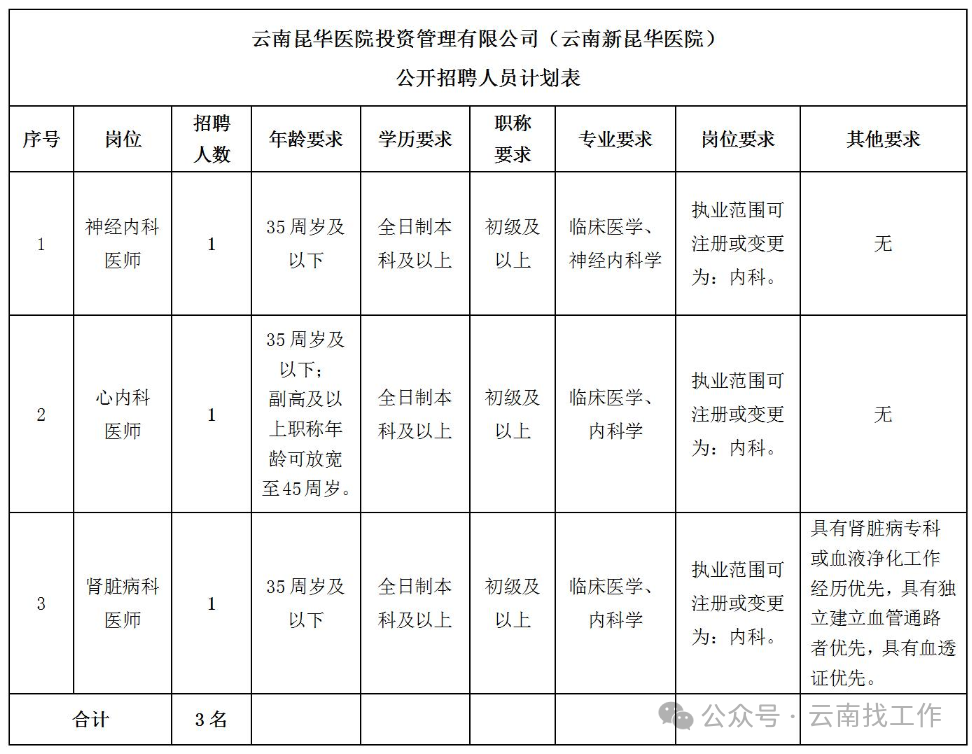 云南昆华医院投资管理有限公司(云南新昆华医院)本次公开招聘3个岗位,共招聘工作人员3名,具体详见下表: