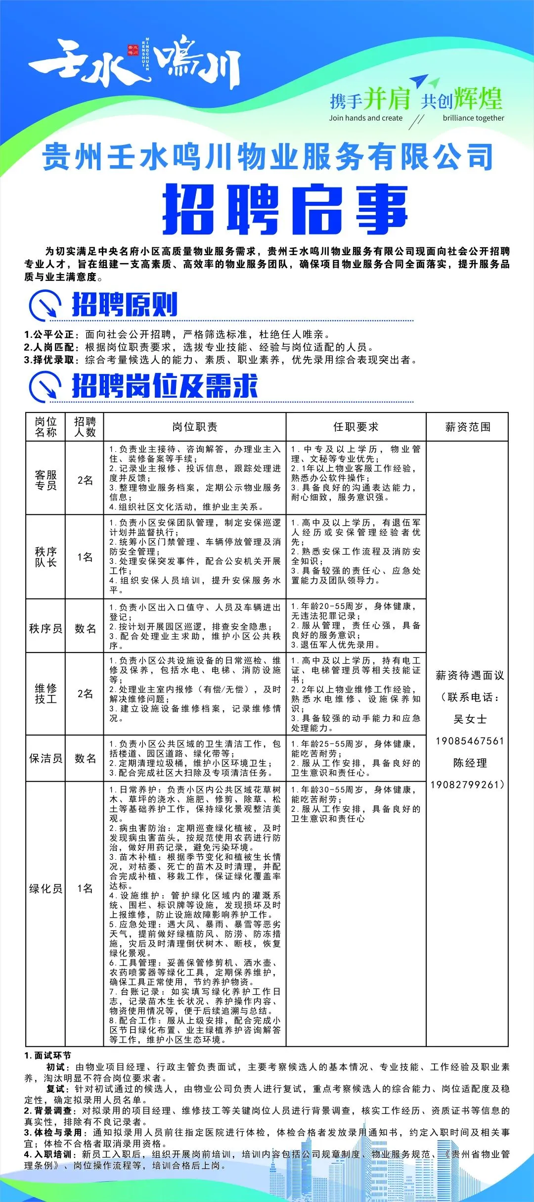 >【县内招聘】贵州壬水鸣川物业服务有限公司招聘客服专员、秩序员、保洁员、绿化员等!!!