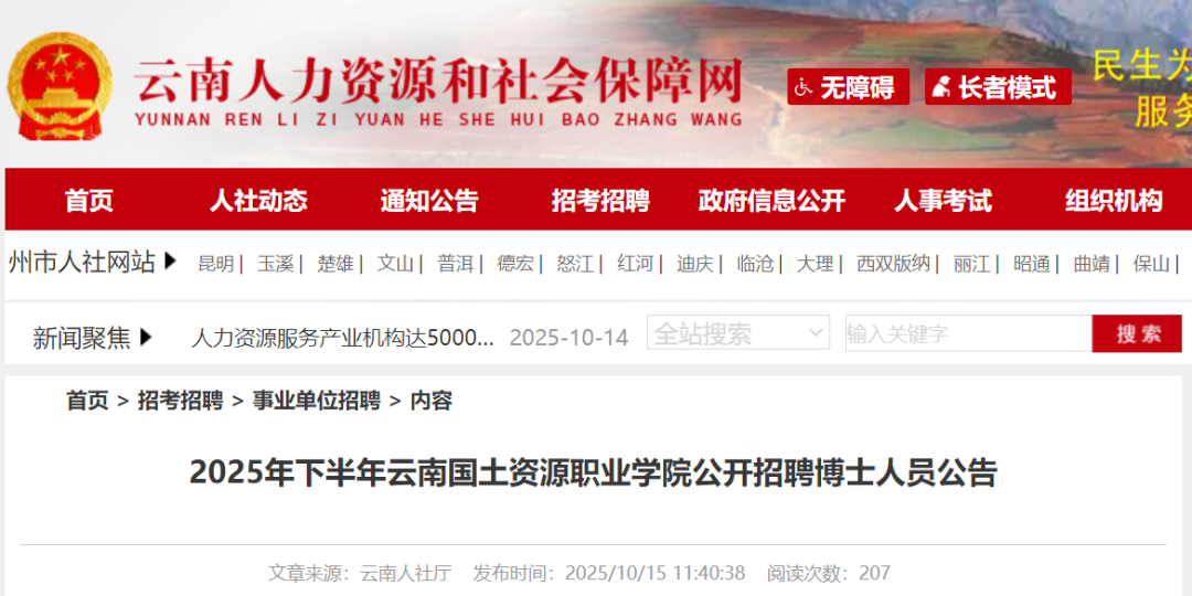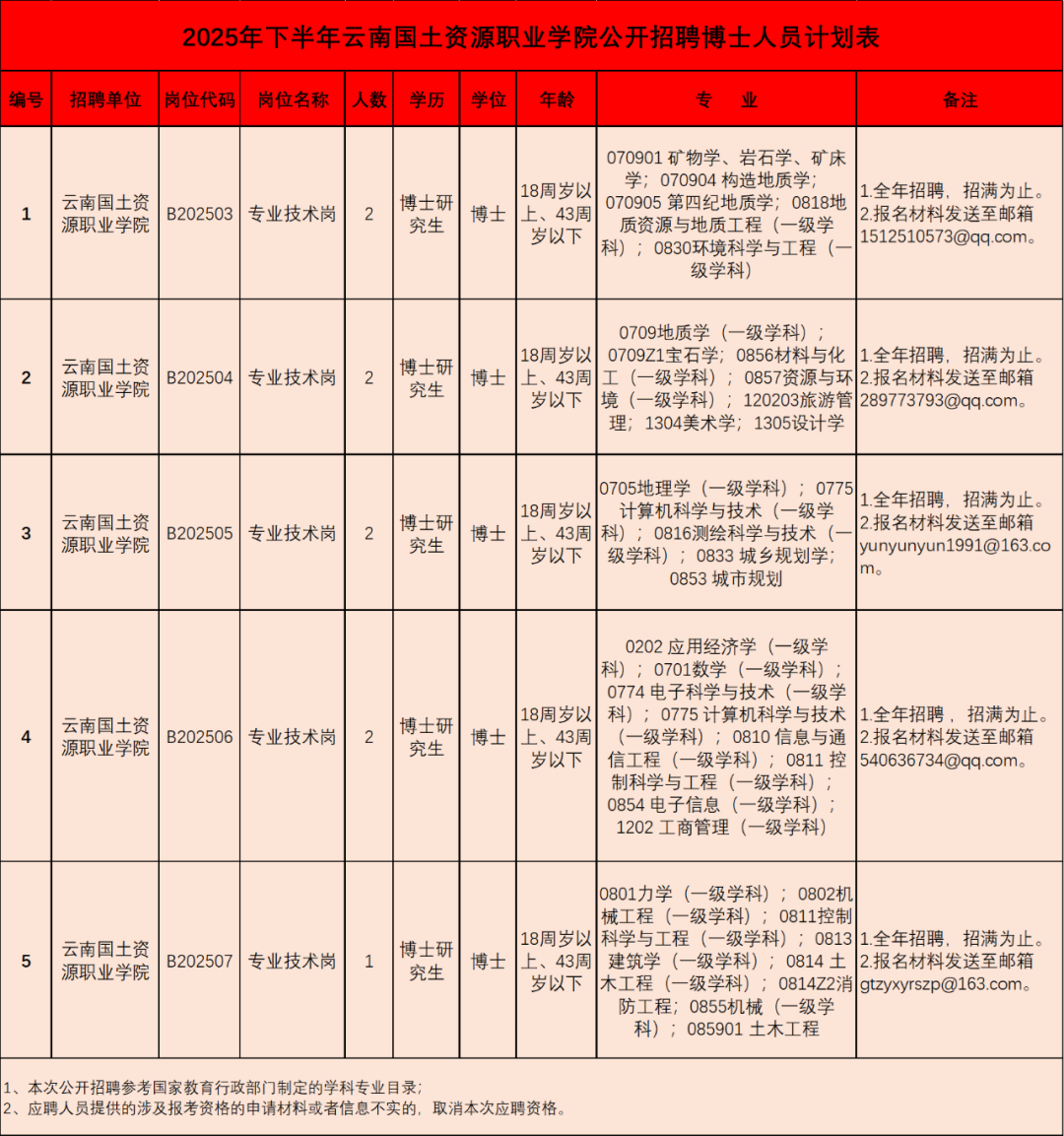 按照《事业单位公开招聘人员暂行规定》(人事部令第6号)、《云南省事业单位公开招聘工作人员办法》(云人社发〔2016〕182号)等法律法规,根据工作需要,经云南省教育厅审核同意报云南省人力资源和社会保障厅核准,2025年下半年云南国土资源职业学院面向社会公开招聘博士人员9名,现将有关事项公告如下: