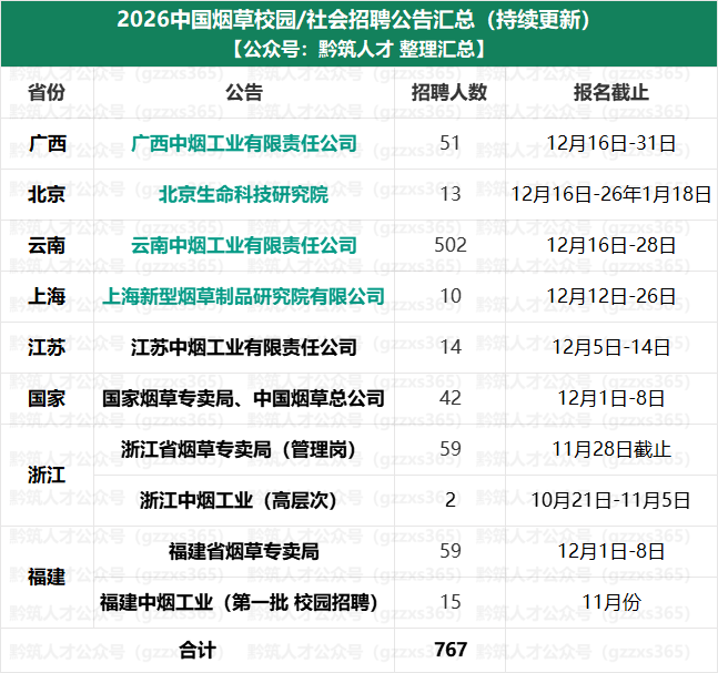 贵州中烟工业有限责任公司2026年招聘公告、贵州省烟草专卖局(公司)2026年招聘公告官方网站(建议提前收藏)