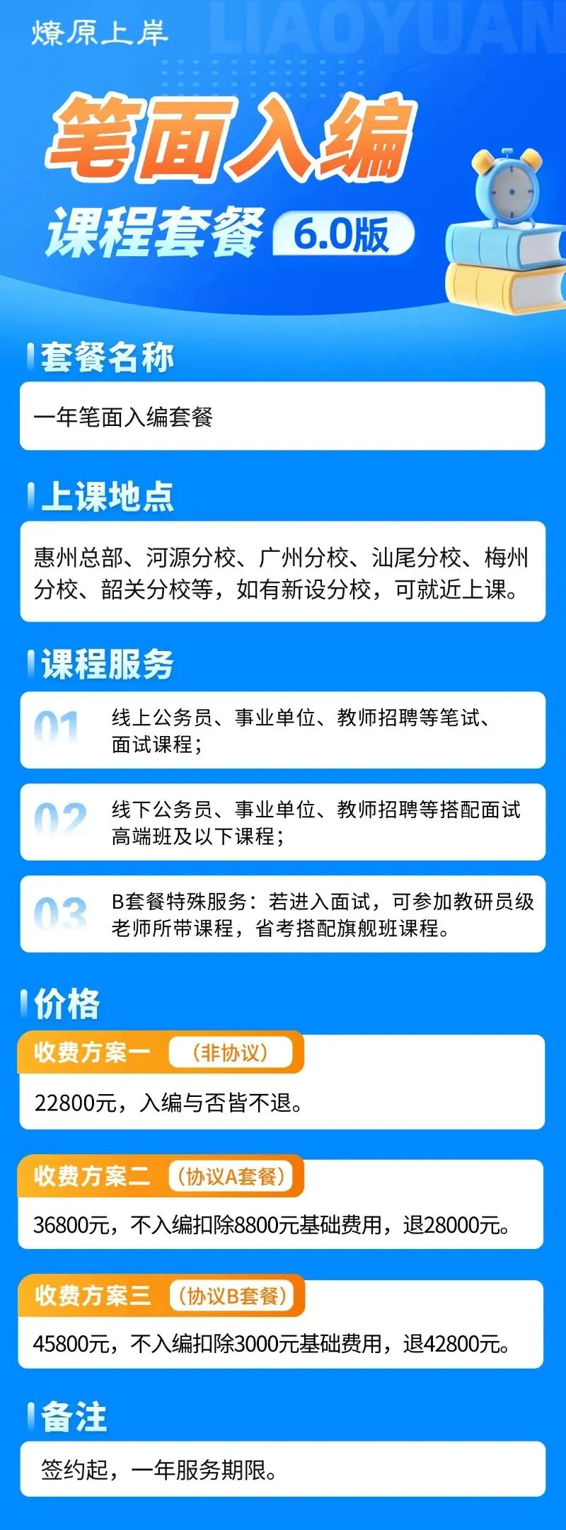 (三)近两年进入编制考试面试环节的考生独享优惠,提供进面依据后,报名协议套餐可享受叠加优惠2000元/人。