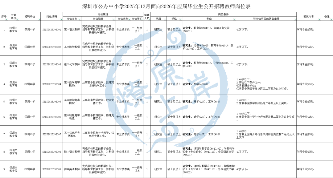 深圳市公办中小学2025年12月面向2026年应届毕业生公开招聘教师公告