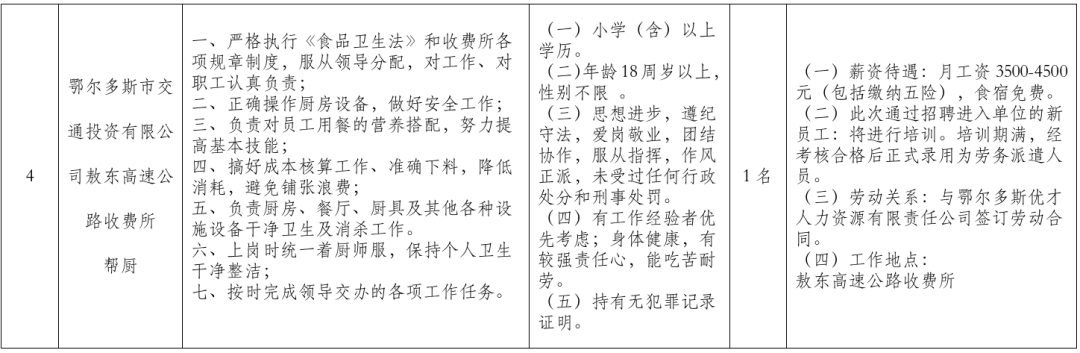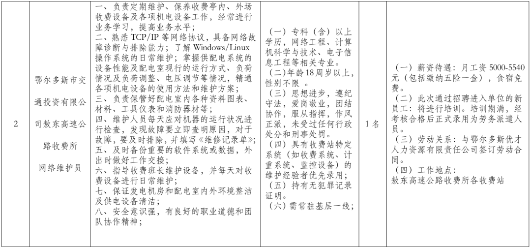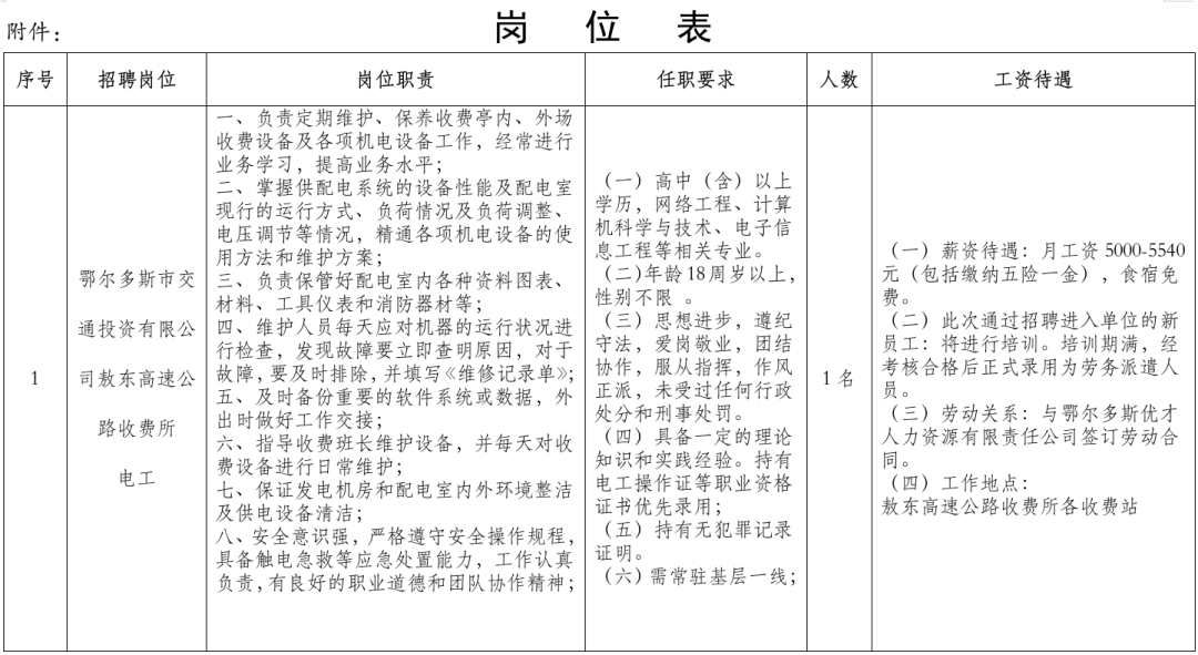 全国招聘信息大全汇总鄂尔多斯市交通投资有限公司敖东高速公路收费所劳务派遣岗位招聘4人公告