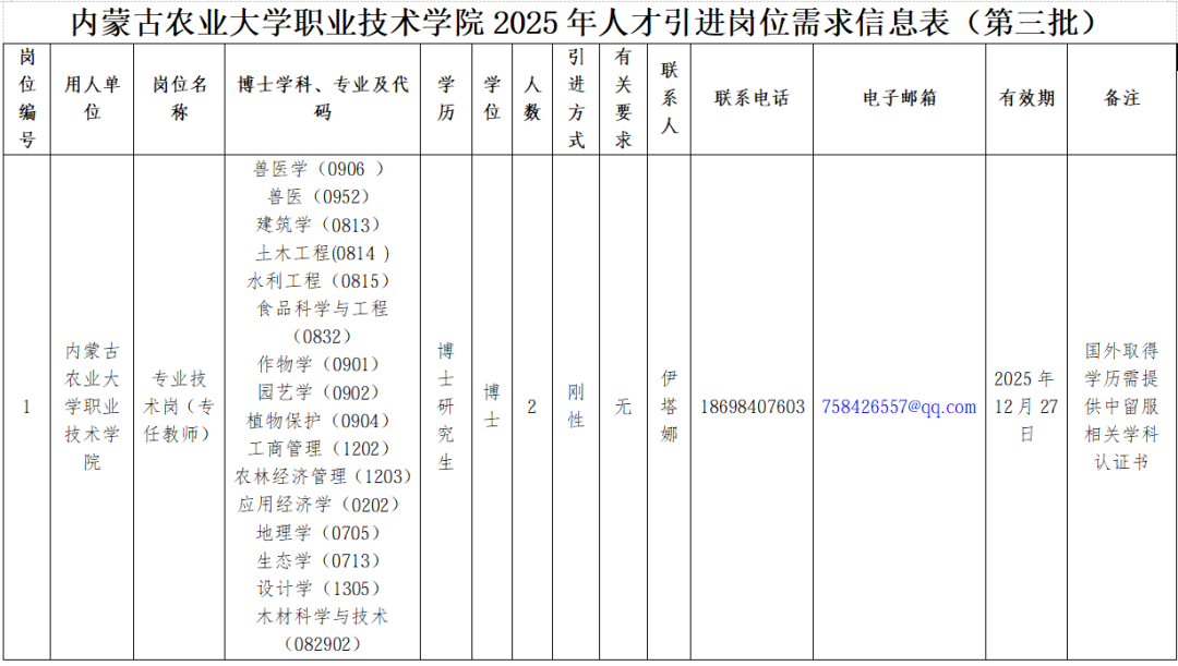 附件:内蒙古农业大学职业技术学院2025年人才引进岗位需求信息表第三批