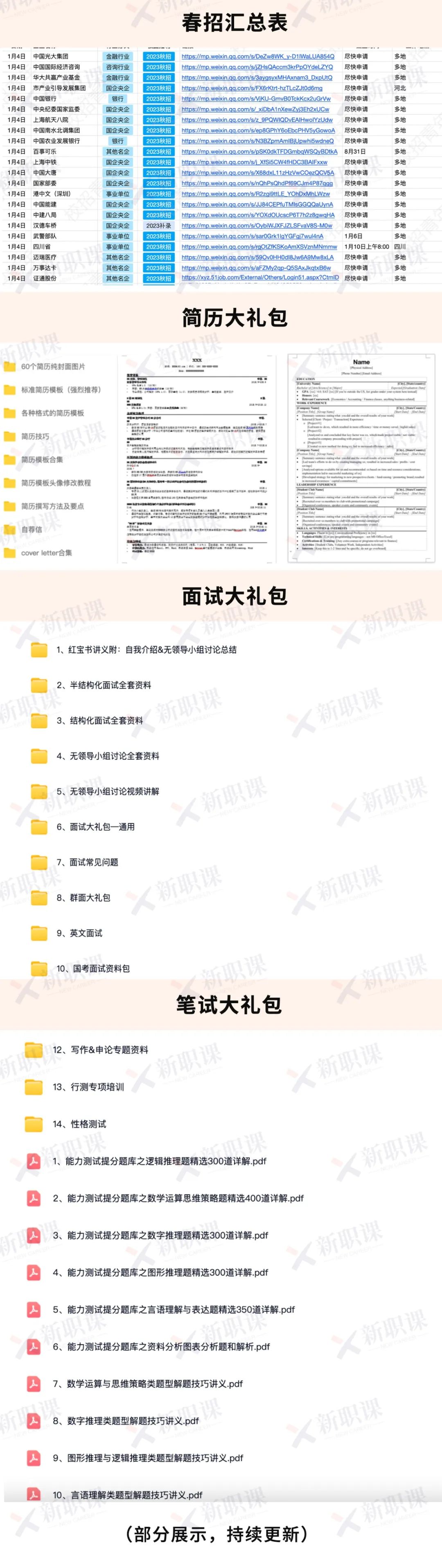 求职快人一步,不想错过更多求职信息,加入求职VIP会员,拿Dream Offer✨??? ?点击获取:9.9元office训练营 ?点击获取:0元网易数据分析训练营 ?点击获取:ESG证书课程+备考资料包 ?点击获取:CFA通关课程+备考资料包 ![]() ![]() ![]() ![]() ??? 注意啦! 我们新建立了一个公众号【投行PEVC求职】 主要发布投行/PE/VC最新实习和校招信息 点击名片关注⬇️ *关注获取更多招聘信息 ⬇️ ⬇️ ⬇️ 包括: ☛ 2023春招网申汇总表(持续更新) ☛ 简历大礼包 (27个行业模板,撰写技巧,推荐信等) ☛ 面试大礼包 (结构化,无领导、常见问题等) ☛ 笔试大礼包(行测,性格测试,逻辑推理等)