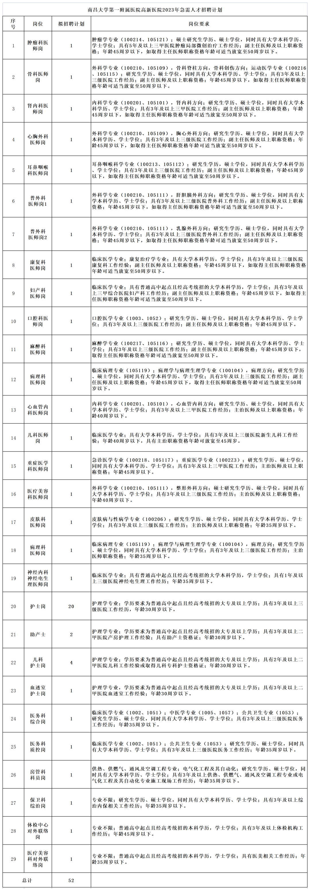 ![]() 招聘岗位 本次公开招聘52名医护工作人员。 (上下滑动查看) ![]() 报考注意事项 1、工作经历和工作年限以与单位建立人事劳动关系为准,工作年限及年龄终算时间为2022年12月31日(需要提供现单位的工作证明或与现单位签订的劳动聘用合同以及缴纳养老保险的证明)。 2、报考医师岗位的考生需取得执业医师资格证及相应的专业技术资格。报考护理岗位的考生均要求取得护士资格证,且男性要求身高165cm以上,女性要求身高156cm以上,矫正视力1.0以上,其中,身高以裸足测量高度为准。特殊情况见岗位条件栏。 ![]() 报名方式 (一)在线报名 1、报名人员根据招聘公告,选择相符职位、据实完整填写《南昌大学第一附属医院高新医院2023年公开招聘报名表》(附件1),将表格以附件的形式发送至医院邮箱ndyfygxfyrsk@163.com,邮件主题为姓名+岗位名称,邮件主题未标明姓名+岗位名称的视为无效投递。 2.报名时间:即日起至2023年3月12日。 3.联系方式: 联系人:江老师、邱老师; 电话:0791-86319106 邮箱:ndyfygxfyrsk@163.com 咨询时间:工作日上午9:00-12:00、下午14:00-17:00 (二)现场资格审查、笔试、面试、体检等安排见后续官网公告 ![]() 待遇说明 1、试用期6个月,待遇按医院现行规定执行,试用期满且考核合格者予以正式聘用,不合格者予以解聘。 2、副主任医师及以上职称资格者享受税前年薪30-60万元,或参照医院同层次人员待遇。试用期3个月,自报到之日起按相应职称发放绩效,试用期考核合格后签订优秀人才聘用合同,按医院急需学科优秀人才待遇规定执行。 3、南昌市人才政策:博士研究生给予每人一次性就业、安家、租房等生活补贴5万元,硕士研究生3万元,本科2万元,大专1万元;首次将户口迁移至南昌(含集体户口),每人发放1000元落户奖励。 4、对外联络岗根据工作业绩发放绩效奖金,其他待遇按医院现行规定执行。 |
