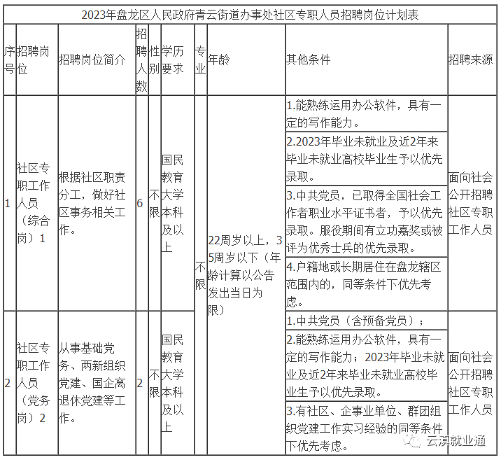 2.招聘人数:共计划招聘8人,其中:综合岗位6人,党务岗位2人。具体岗位设置及岗位要求可参阅《2023年盘龙区人民政府青云街道办事处社区专职人员招聘岗位计划表》(见附件1)。
