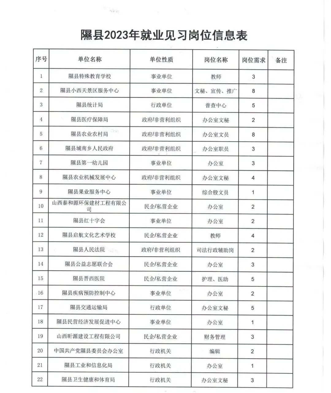 附件:隰县2023年就业见习岗位信息一览表