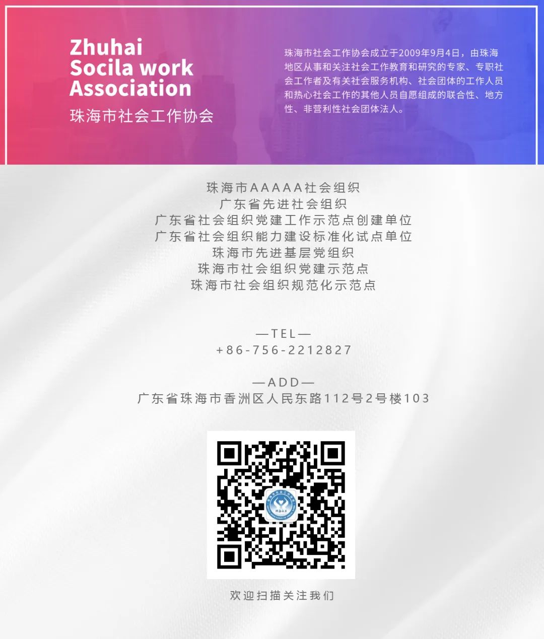 珠海市社会工作协会成立于2009年9月4日,由珠海地区从事和关注社会工作教育和研究的专家、专职社会工作者及有关社会服务机构、社会团体的工作人员和热心社会工作的其他人员自愿组成的联合性、地方性、非营利性社会团体法人。协会秉持"以人为本,助人自助”的理念,把握“高质量发展”首要任务,紧扣“民生为要”主题,立足“打造市级枢纽平台 深耕基层社会治理”的协会定位,服务粤港澳大湾区建设国家战略,在专业人才队伍、社工服务领域开拓、社会治理创新和社会组织党建等方面进行了积极探索,为推动社会工作专业发展作出了重要贡献。协会共有会员150个,其中单位会员65家、个人会员85人,单位会员覆盖了全市近九成规模以上社工机构。近年来,协会复评荣获“珠海市5A级社会组织”,获评“广东省先进社会组织”、“珠海市先进基层党组织”、“广东省社会组织党建工作示范点创建单位”、“珠海市社会组织规范化示范点”、“珠海市社会组织党建示范点”(简称一5A、两先进、三示范)等荣誉,是广东省社会组织能力建设标准化试点单位,充分展现出协会在推进行业高质量发展和创新社会治理等方面发挥的重要作用。