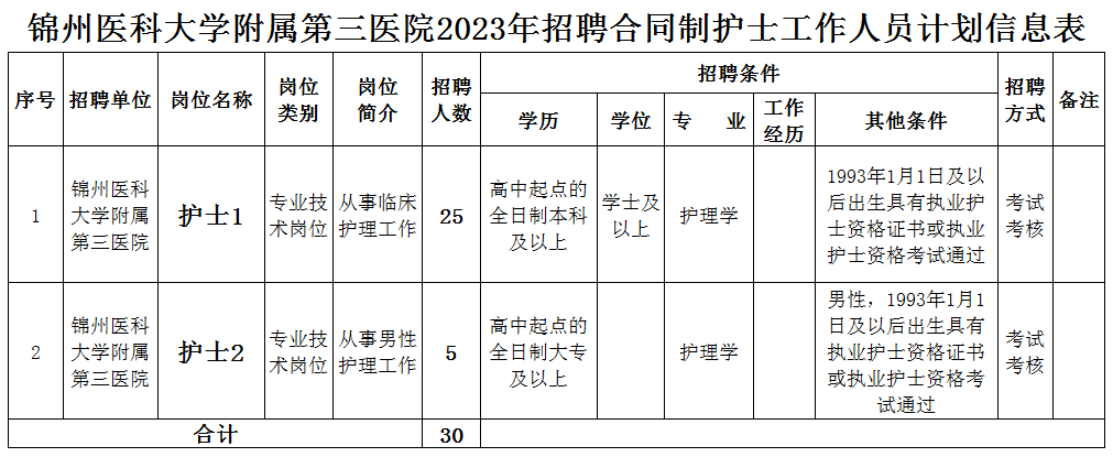 因医院工作需要,现面向社会招聘合同制护士30名,具体公告如下:此次招聘工作坚持“公开、平等、竞争、择优”的原则,严肃纪律,秉公办事,严禁弄虚作假,徇私舞弊,全程接受纪检监察部门和社会的监督。符合报考基本条件和招聘岗位具体资格条件的普通高等院校应届、往届毕业生及社会在职、非在职人员均可报名应聘。(四)具备岗位所需的专业或技能条件,适应岗位要求的身体条件;(五)岗位所需要的其他条件,详见《锦州医科大学附属第三医院2023年招聘合同制人员计划表》(附件1)(见文中最下方)。曾因犯罪受过各类刑事处罚,有犯罪嫌疑尚未查清或正在接受纪律审查的,国家法律法规规定不得聘用的其他人员,均不得报考。应聘者的资格条件或相关资历的计算日期为报名截止之日。应聘人员必须已经取得相应学历、学位证及资格证原件,岗位有特殊要求的以计划表中具体岗位要求为准。此次招聘报名、资格审核、理论考试、面试、体检、公示等所有环节信息均发布于锦州医科大学附属第三医院官网(http://www.lnmu3h.com),不进行电话通知,请应聘者随时查看,未在规定时间参加招聘任一环节,均视为自动放弃此次应聘。2023年8月28日9:00-2023年9月13日15:00(休息日除外)。报名人员本人持身份证、毕业证书、学位证书、资格证书原件、复印件及在学信网打印的学历证明或学籍证明(保证报名之日起2个月内认证有效),近期免冠一寸照片2张,填写《锦州医科大学附属第三医院招聘合同制人员报名表》(附件2)1份,到锦州医科大学附属第三医院人力资源部407房间报名。报名实行诚信承诺制度,报名者填报的信息应真实有效,如发现材料虚假者随时取消其考试或应聘资格。每名考生只能报考一个岗位。报名结束后,我院将严格按照公告及岗位资格条件,对考生报名资格进行现场审查确认。主要审查报名者提供的身份证、学历学位证书、资格证书以及招聘信息中所涉及的资历和其他条件要求的证明材料。资格审查贯穿招聘全过程,一经发现考生不符合报考岗位要求或弄虚作假的,随时取消考生考试和应聘资格。未在规定时间接受资格审查者,视为自动放弃。采取笔试和面试(包括基本素质考核与专业技能考核)相结合的办法,两项考试满分各为100分,最后按照5:5的权重比例计算应聘人员的总成绩。基本素质考核与专业技能考核各为50分,二项合计为应聘人员的面试成绩。面试成绩60分及以上为合格。总成绩在我院官方网站公布。总成绩60分及以上为合格,按照总分从高分到低分的顺序按招聘计划1:1的比例确定参加体检人选。总成绩并列者,根据面试成绩由高到低的顺序确定。体检在我院体检中心进行,体检合格者,给予录用。拟聘人员信息统一在锦州医科大学附属第三医院官方网站进行公示,公示期为5个工作日。公示结束后,对公示无异议人员办理入职手续。对于公示有异议的人员,我院将调查核实,并提出处理意见。招聘的人员按规定实行试用期制度,试用期一般不超过6个月,国家另有规定的按规定执行,试用期包括在聘用合同期限内。新入职人员实行试用期考核制度,在试用期满前1个月之内组织考核,考核合格的,予以正式聘用;不合格的,取消聘用。报考者有弄虚作假、违纪违规行为的,一经发现,均取消其考试或应聘资格,并将有关情况通报其所在学校或单位。构成犯罪的,依法追究刑事责任。本次录用人员待遇与医院同级同类合同制人员享受相同待遇。 1.本次考试不指定考试辅导用书,不举办也不委托任何机构举办考试辅导培训班。目前社会上出现的任何辅导班、辅导网站或发行的出版物、上网卡等,均与本次考试无关。敬请广大报考者提高警惕,切勿上当受骗。2.考生自报名至拟聘用人员公示(资格审查、笔试、面试、体检)期间,应确保报名时所填报的通讯工具畅通,以便我院联络,因所留通讯方式不畅所致后果,由考生自负。3.在招聘期间,如不按规定参加资格审查、笔试、面试、体检、办理有关手续等,视为自动弃权。4.在体检环节,因体检不合格、自愿弃权、弄虚作假被取消应聘资格及其他原因出现岗位空缺,将进行递补,按总成绩从高到低的顺序等额递补。总成绩并列者,根据面试成绩由高到低的顺序确定。附件1:锦州医科大学附属第三医院2023年招聘合同制人员计划表(见下图)