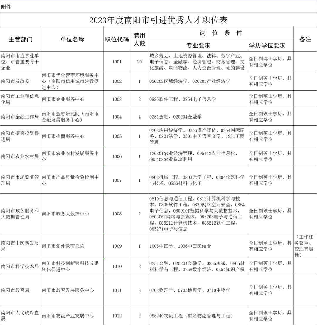 硕士研究生招聘职位,详见《2023年度南阳市引进优秀人才职位表》。(图片可放大查看)