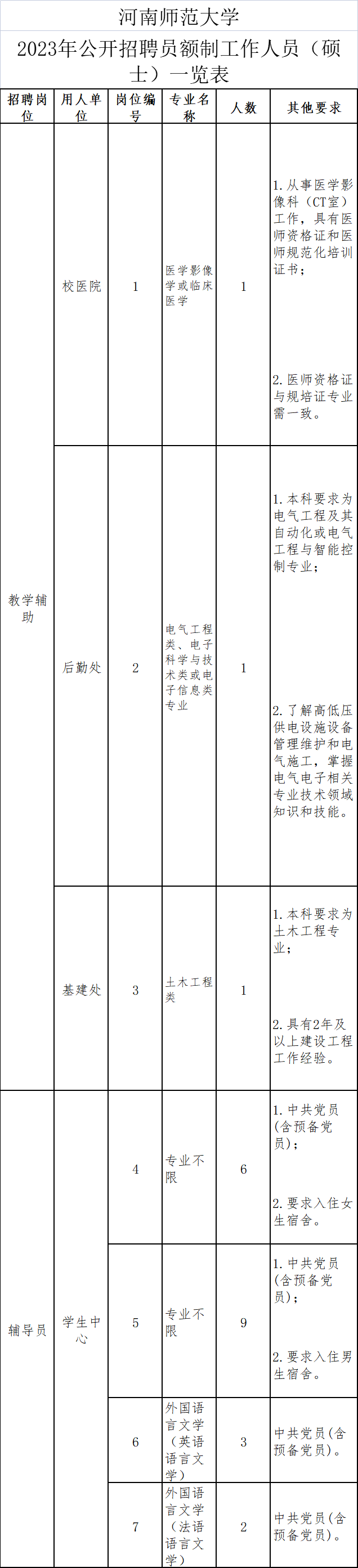 8.其他要求见附件《河南师范大学2023年公开招聘员额制工作人员(硕士)一览表》。