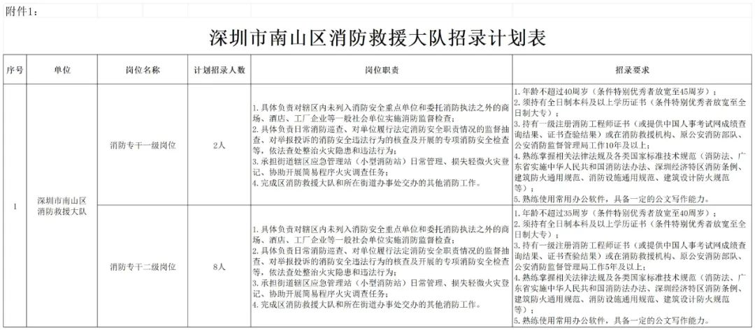 每人限报考一个岗位,各岗位工作任务及职责详见《深圳市南山区消防救援大队招录计划表》(详见附件1)。