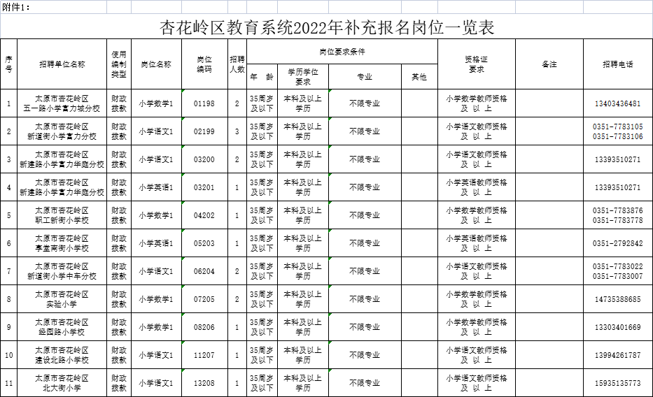 附件1:杏花岭区教育系统2022年补充报名岗位一览表.xls