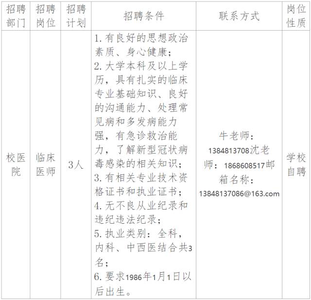 (二)医师3名为学校自聘,按照学校相关待遇执行。