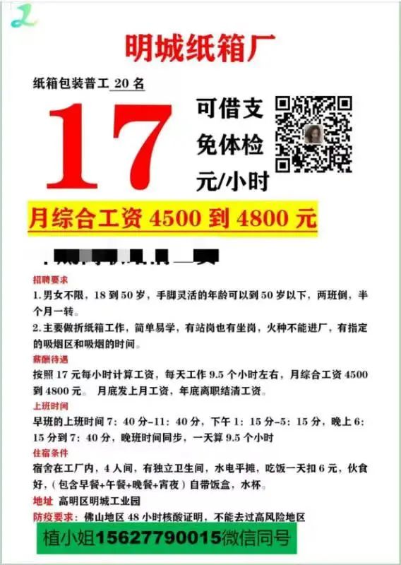 12.明城纸箱厂招聘普工20人,两班倒,17元一个小时,年龄45岁以下
