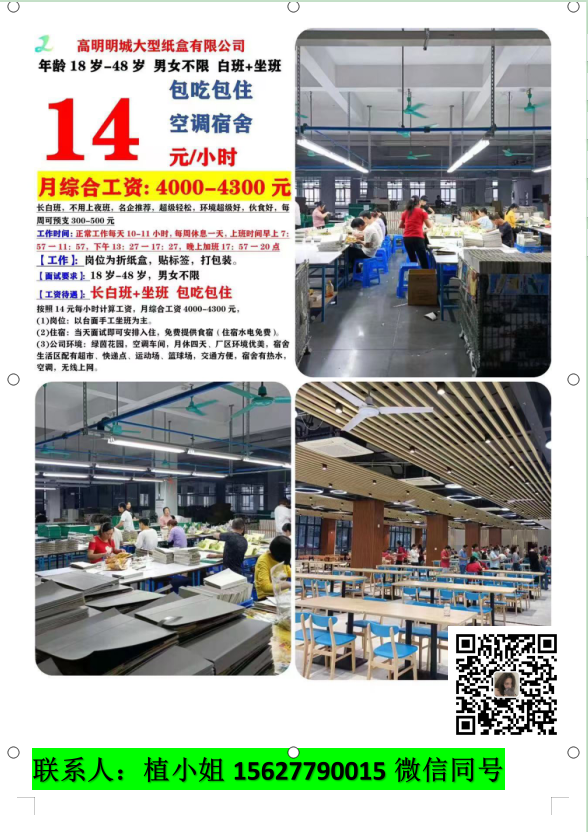 2.高明杨梅包装材料有限公司招聘普工10人 (本公司有厂车,每天往返高明市区,途径人和,三洲,河江,市区)(年后2月1号面试),按18元每小时,187元每天,月薪可达5000元到5500元, 每月休息2到4天,包吃包住