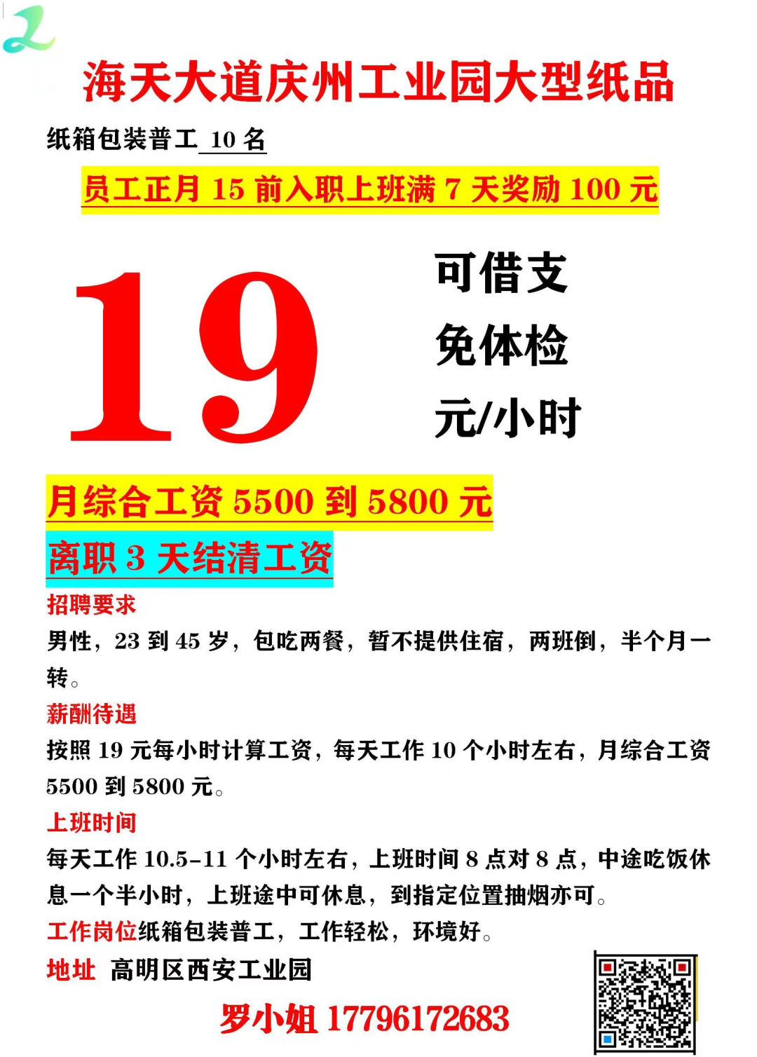 8. 仙村工业区大型纸品厂招男工8名 2月1人开始送人