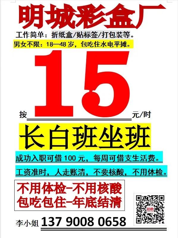 12.明城纸箱厂招聘普工20人,两班倒,17元一个小时,年龄45岁以下