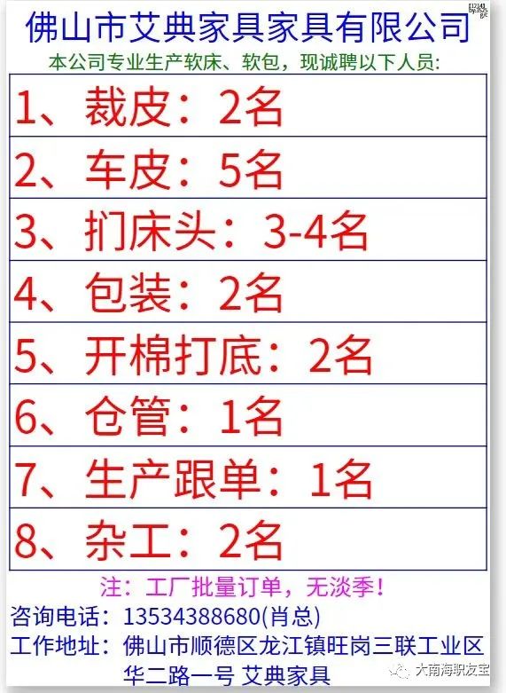 【岗位】:普工10人(贴海棉,打螺丝,上下挂件,简单易学,岗位有站有坐),工期3个月,【待遇】:15元/小时,包吃包住