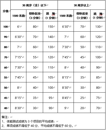 体能测试具体标准详见《上海市消防救援总队政府专职消防员招考体能测评项目和标准》。