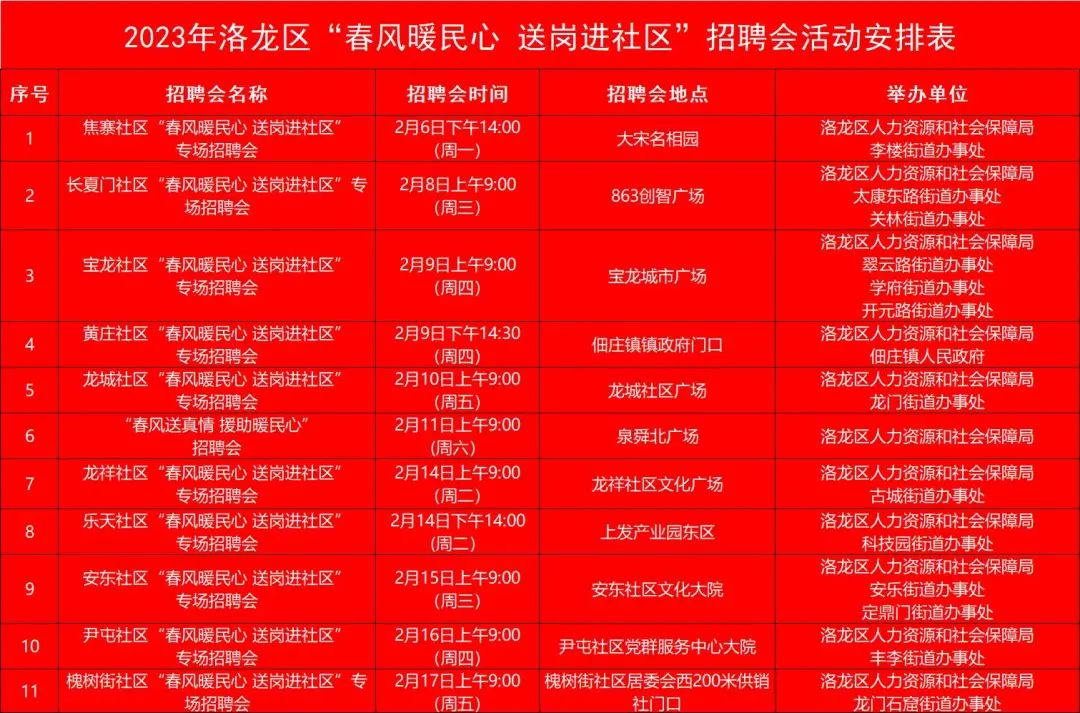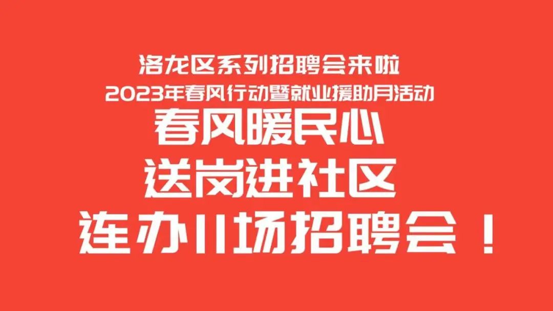 洛龙区“春风暖民心,送岗进社区”系列招聘会活动来了,此次活动共计11场!报名参会单位406家,提供岗位15369个!活动均选在辖区内各镇办人流量大的商圈和社区广场。