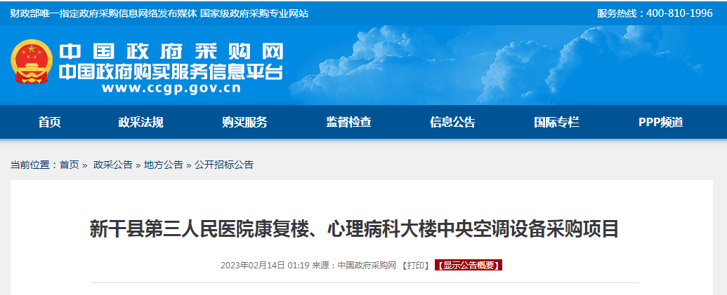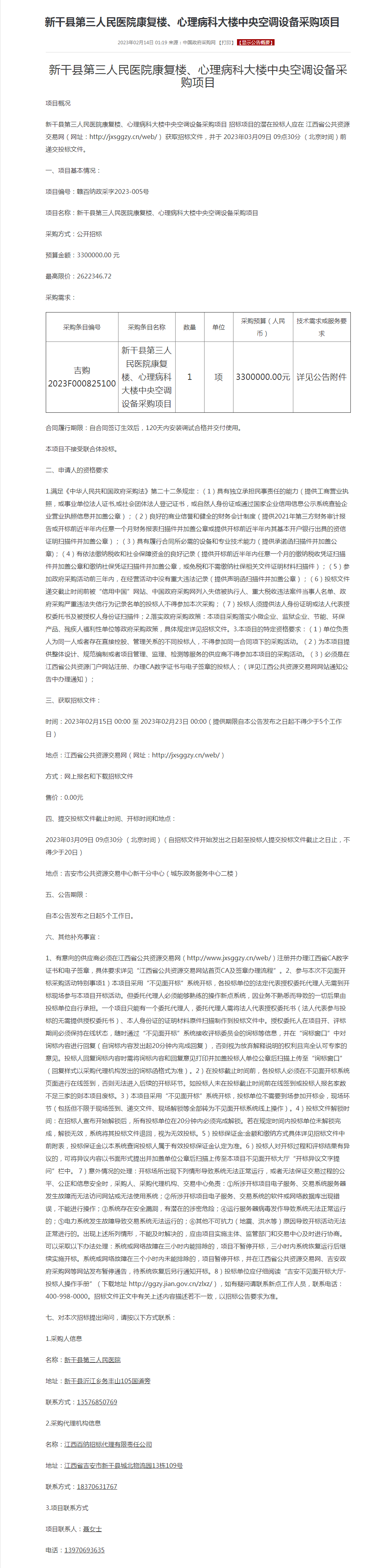 6.项目概况:新干县第三人民医院康复楼、心理病科大楼中央空调设备采购项目 招标项目的潜在投标人应在 江西省公共资源交易网(网址:http://jxsggzy.cn/web/) 获取招标文件,并于 2023年03月09日 09点30分 (北京时间)前递交投标文件。