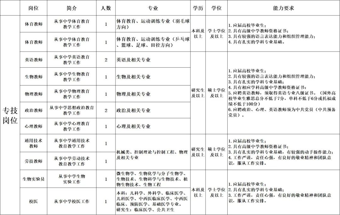 我校2023年拟招聘英语教师2名、政治教师2名、物理教师1名、生物教师1名、心理教师1名、体育教师2名、通用技术教师1名、劳动技术教师1名、生物实验员1名、校医1名。